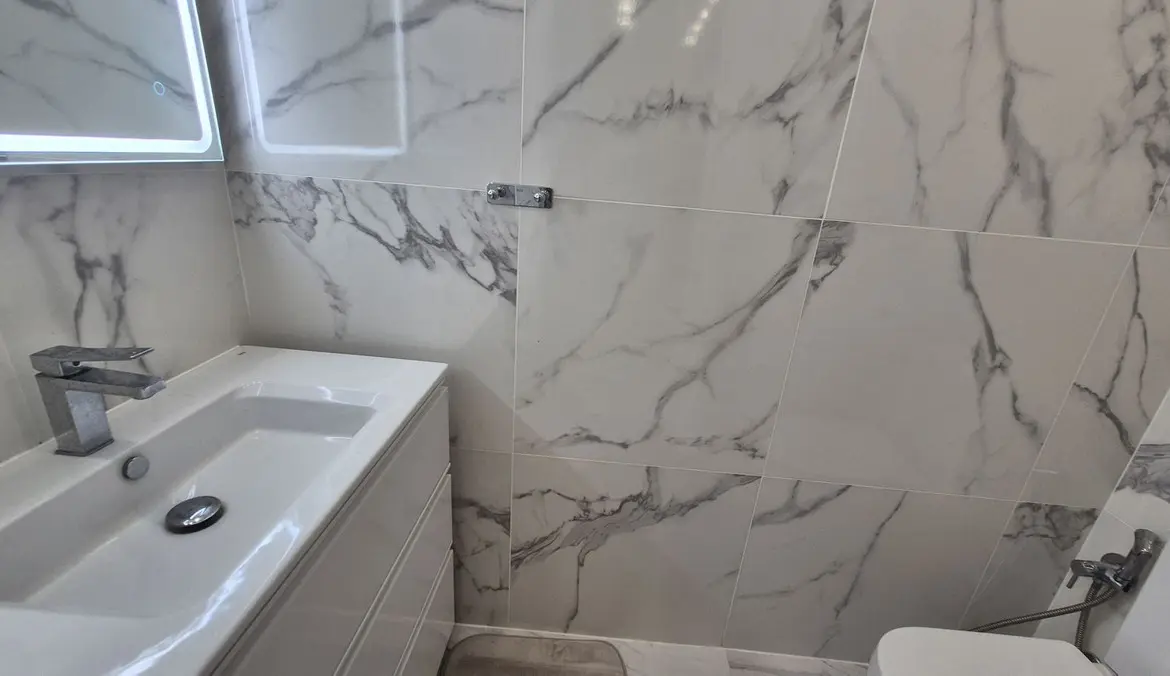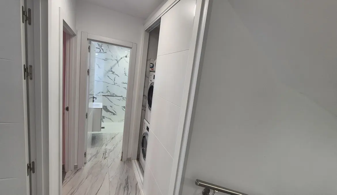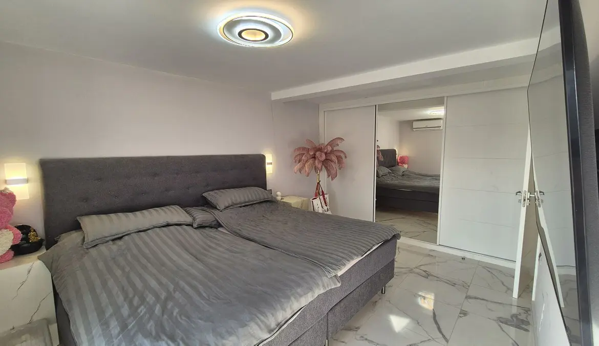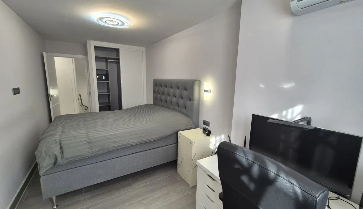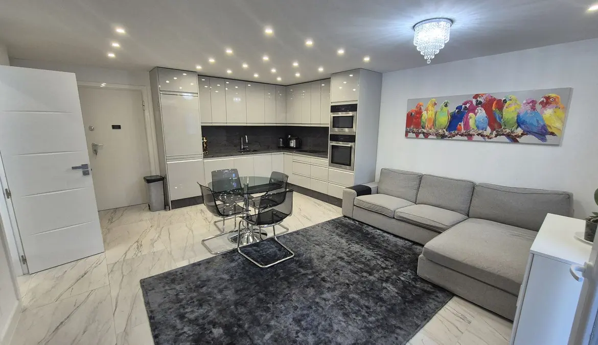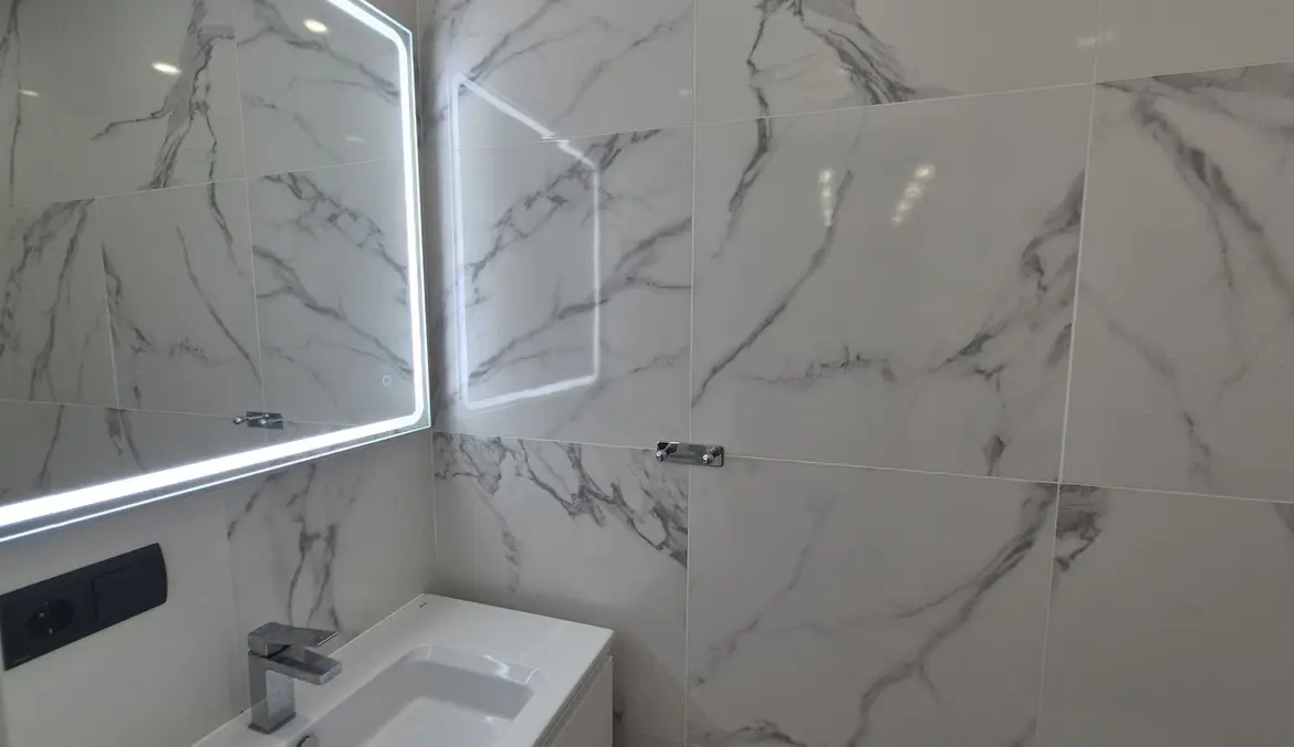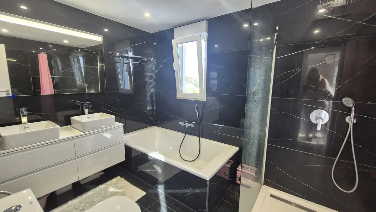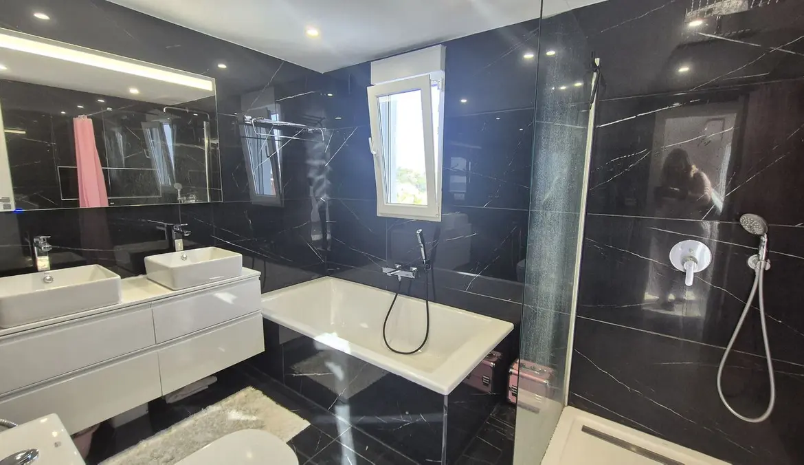 The bright and spacious living area welcomes you with premium marble floors and underfloor heating, creating a warm, sophisticated ambiance year-round. The open-plan design flows seamlessly into a state-of-the-art kitchen featuring sleek Cosentino countertops and top-quality Miele appliances, ideal for culinary creativity or casual entertaining. Step outside onto your private terrace and enjoy peaceful breakfasts, sunset dinners, or relaxing afternoons in the sun.