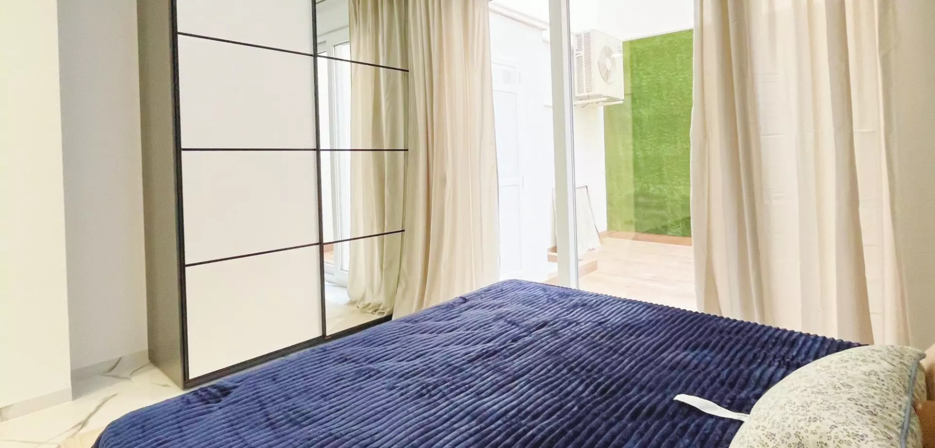 As you step inside, you’ll find an open-plan living and dining area that is bright and welcoming. Floor-to-ceiling windows ensure ample natural light fills the space. The contemporary kitchen includes high-quality appliances, matte black countertops, and attractive cabinetry. This blend of functionality and aesthetics makes the kitchen a practical area for daily use.