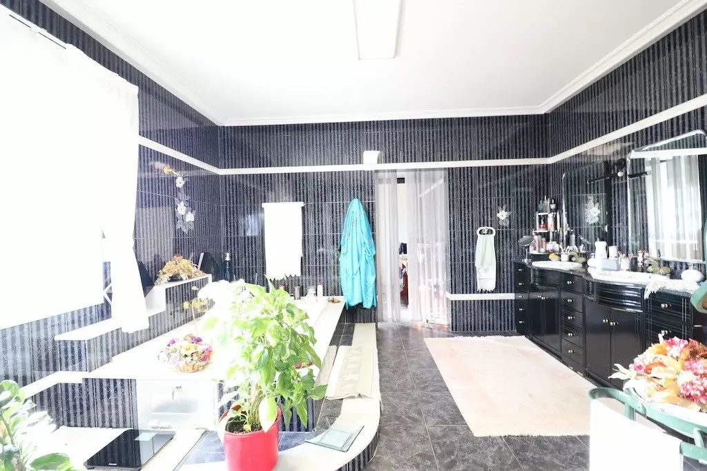 The villa boasts several terraces and a solarium that offers unobstructed views, perfect for enjoying the outdoor atmosphere. A large pool area complements the expansive green spaces, creating an inviting environment for various outdoor activities.