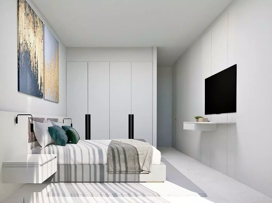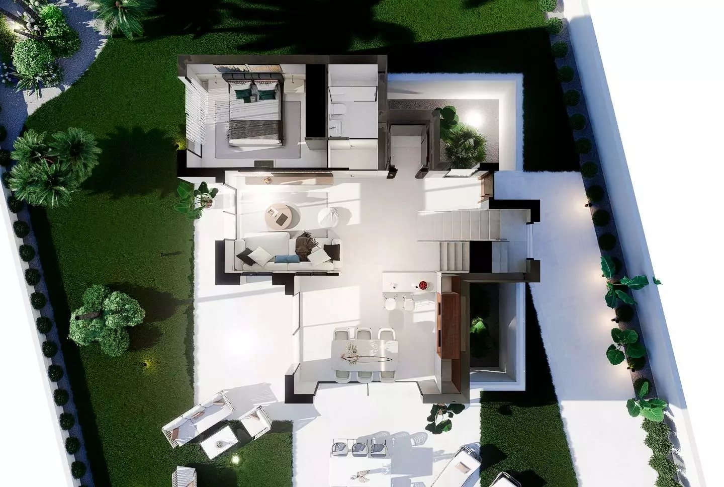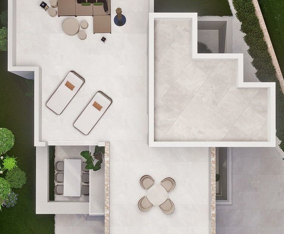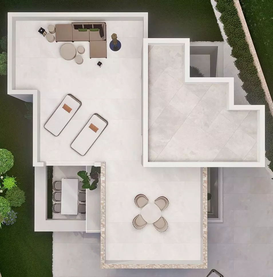 These new villas are constructed over two floors and provide three bedrooms and three bathrooms. The layout includes an open-plan kitchen that flows into the lounge area, built-in wardrobes for storage, and a private solarium. Each property also comes with its own garden, private pool, and a designated parking area for two vehicles.