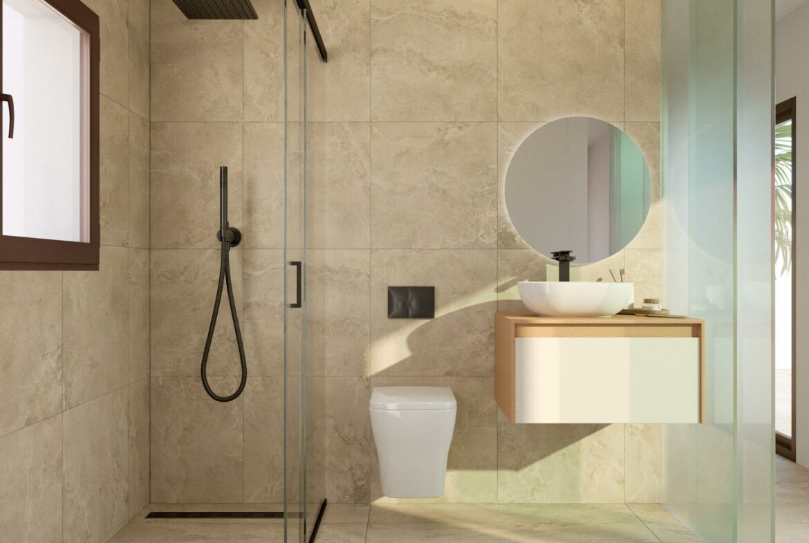 These villas are structured over two floors and include three bedrooms and two bathrooms. The layout features an open plan kitchen that flows into the living area. Large windows provide ample natural light and direct access to the terrace and swimming pool.