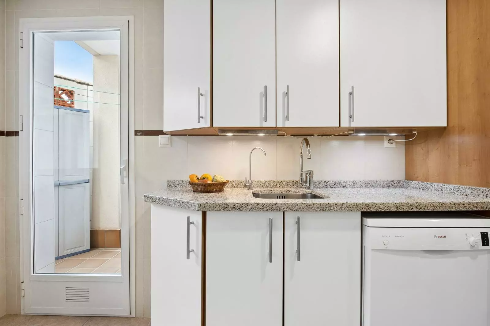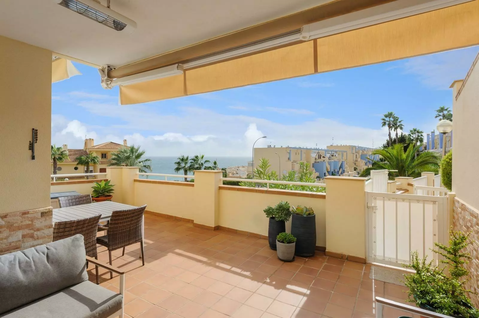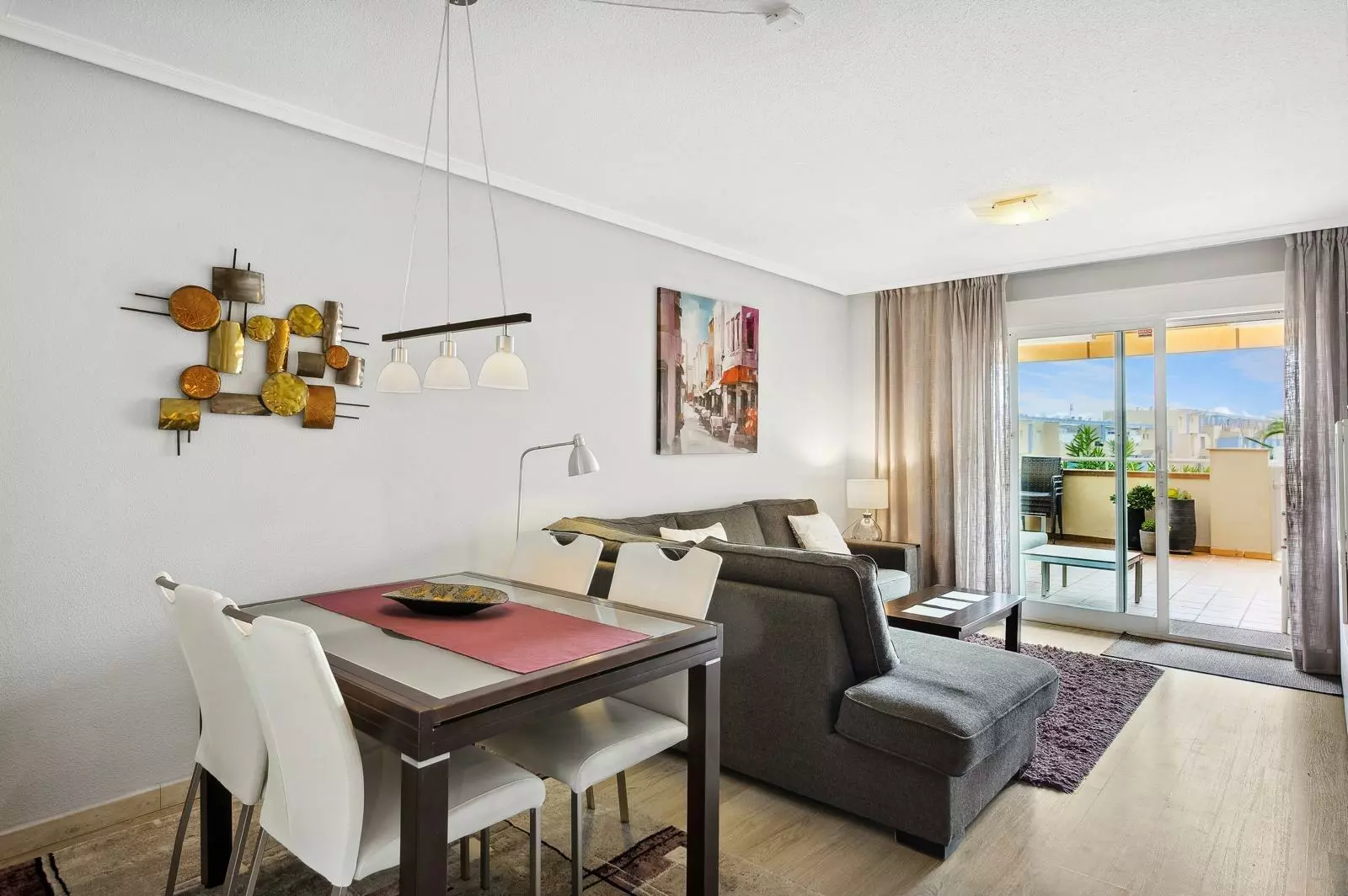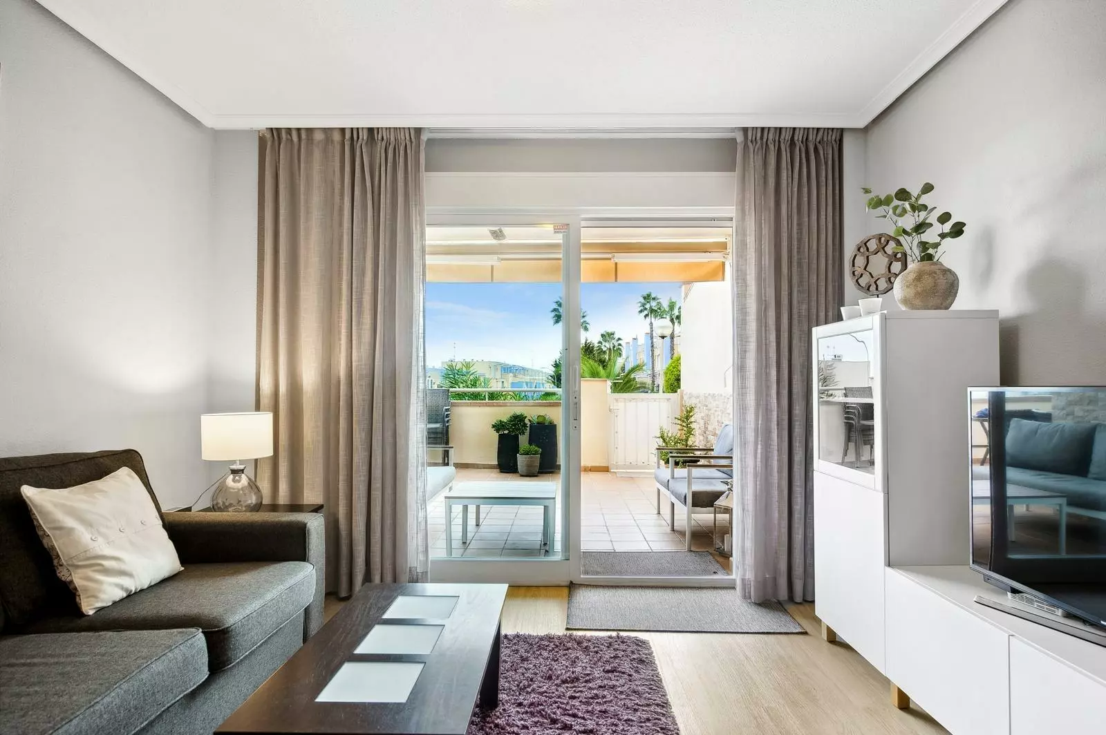 Access the private terrace from the living room, where you can enjoy sea views. This outdoor space serves as an excellent spot for relaxation or entertaining, taking advantage of the Costa Blanca climate. The terrace is large enough for outdoor furniture, creating a welcoming area to enjoy the outdoors.