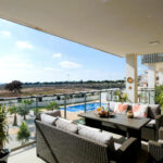 This apartment includes three bedrooms, with the master bedroom featuring an en-suite bathroom. In total, there are two full bathrooms in the unit. Each room is designed with large windows, providing an abundance of natural light and a sense of openness.