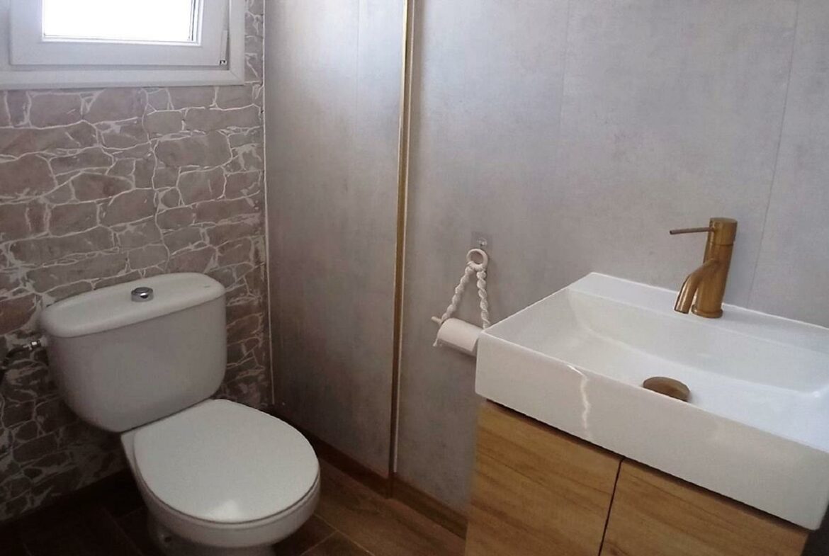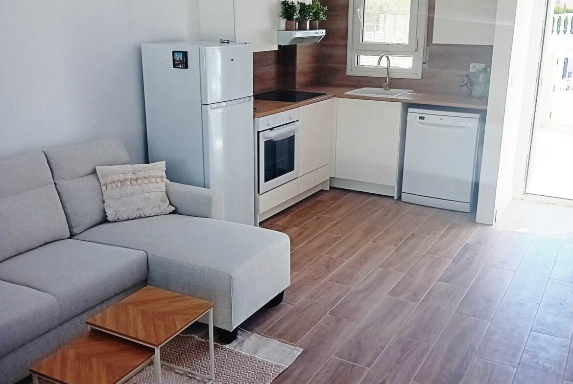 For added convenience, the ground floor also includes a guest cloakroom, making it easy to host visitors. Going up the stairs, you will find two bedrooms along with a family bathroom that has a shower. The master bedroom stands out with a balcony that provides views of the communal pool and gardens, as well as the sea.