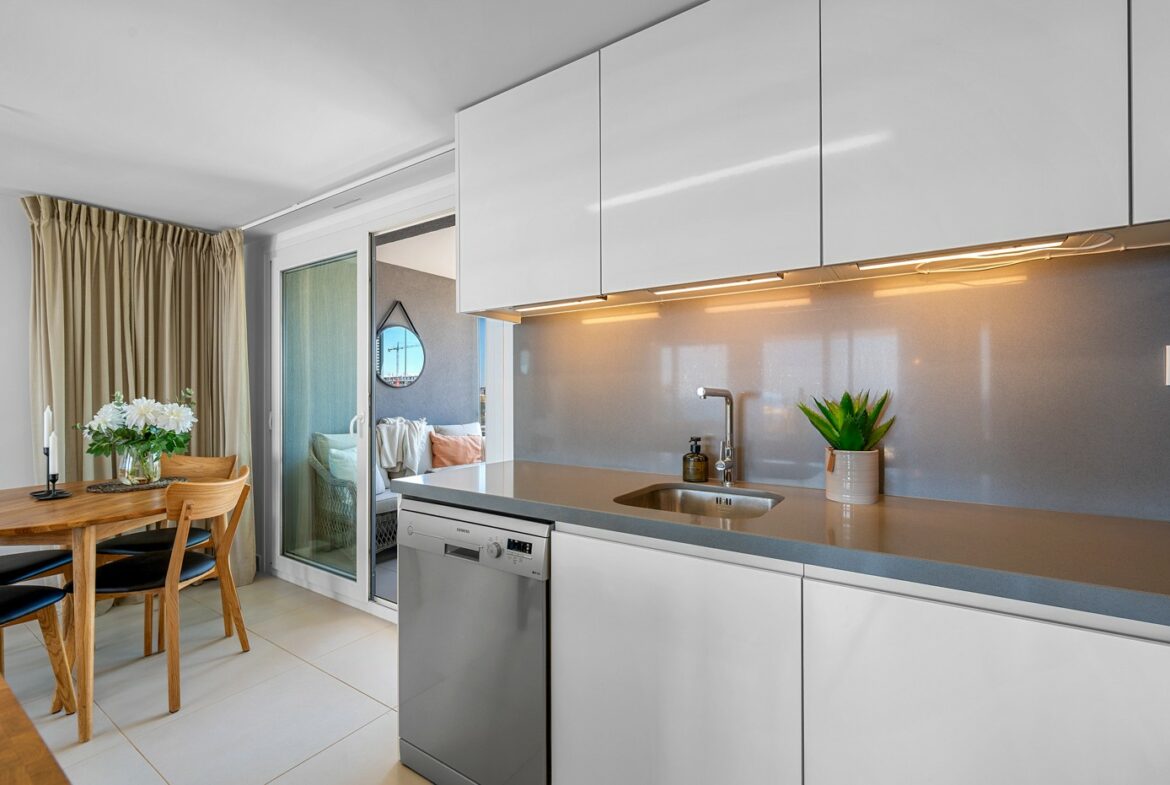 This apartment includes two bedrooms and two bathrooms, along with an open-plan kitchen and living area. The layout reflects a practical use of space, designed to facilitate everyday living. Quality materials have been used throughout, ensuring durability and style.