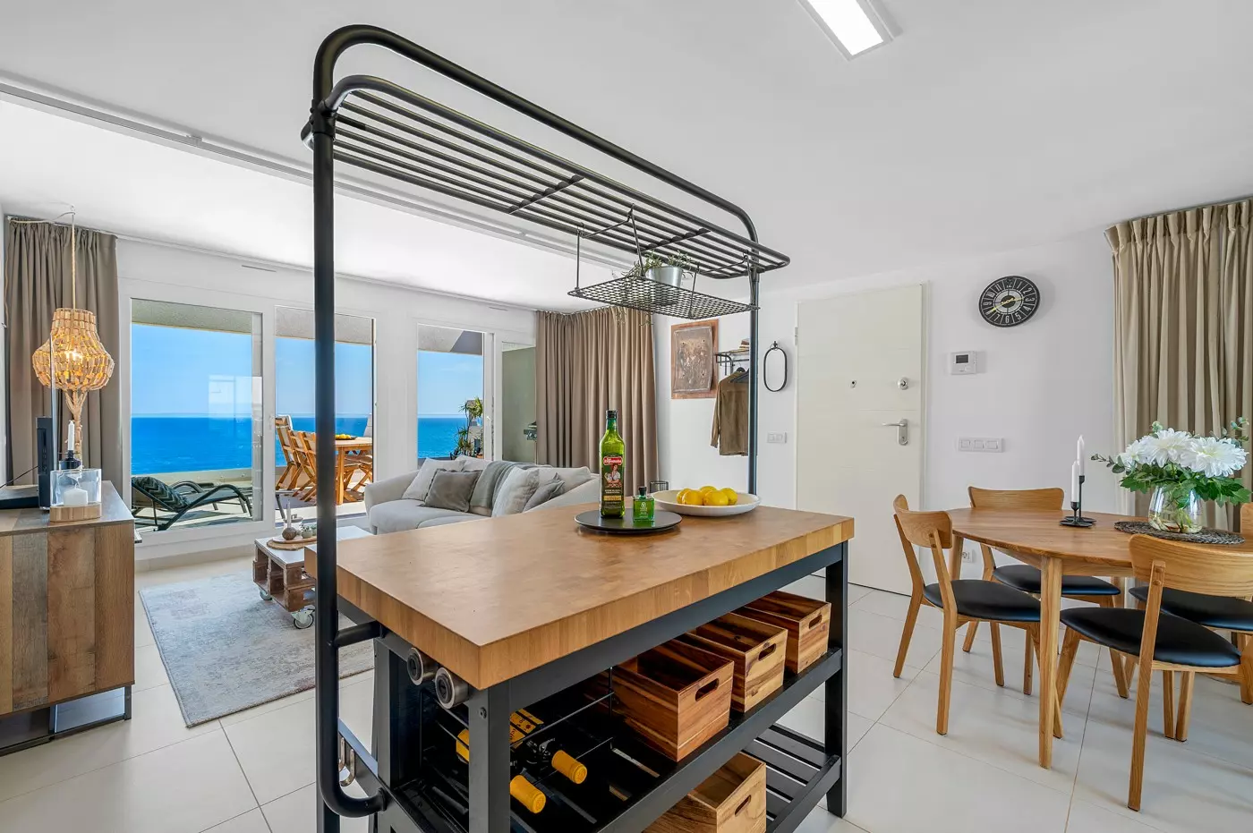 The entrance opens directly into the kitchen and living area, which benefits from ample natural light flowing through large windows. The kitchen is fully equipped, making it suitable for both everyday cooking and entertaining. Adjacent to the living room is a sizeable east-facing terrace that allows residents to enjoy expansive sea views. This space is ideal for gatherings or simply relaxing while listening to the waves.