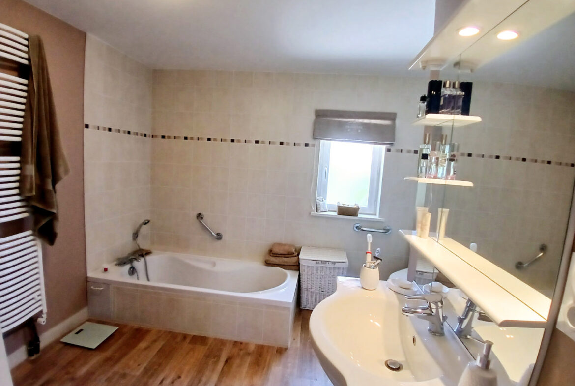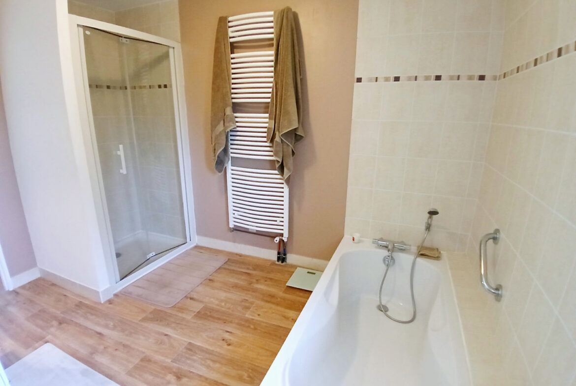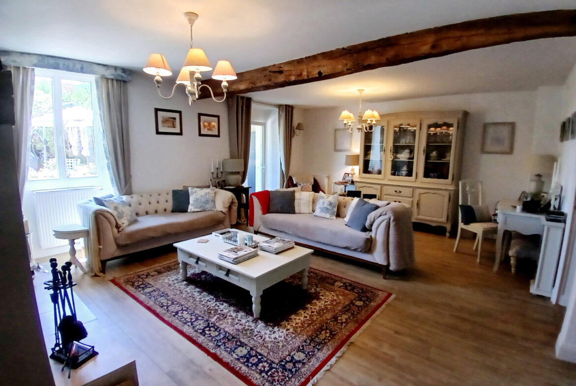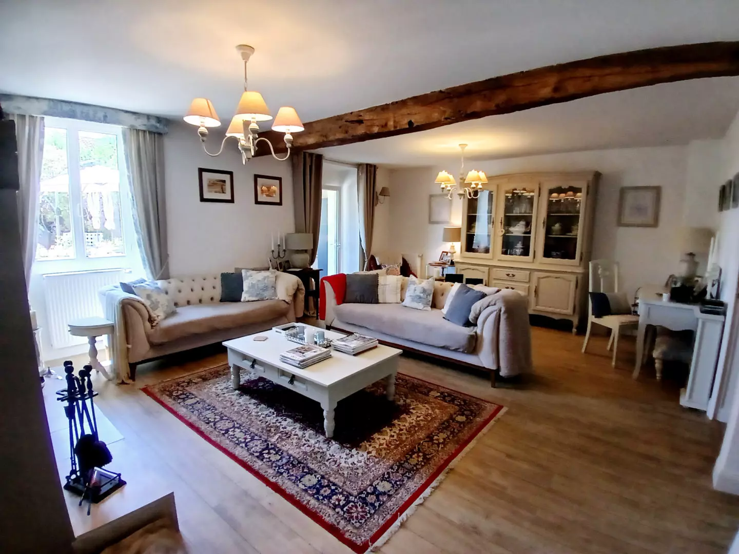 This property offers a unique design featuring two main sections. The original stone house invites you in with an oak door that leads to the vestibule. From there, you enter a large sitting room equipped with a wood-burning stove. The ground floor consists of two double bedrooms and a shower room. The first floor includes a third bedroom along with another shower room. A staircase provides access to the basement, which houses a wine cellar and a double garage.
