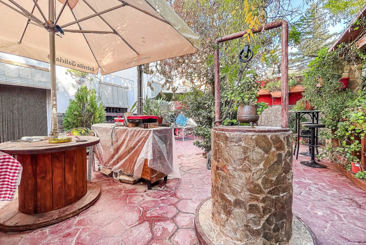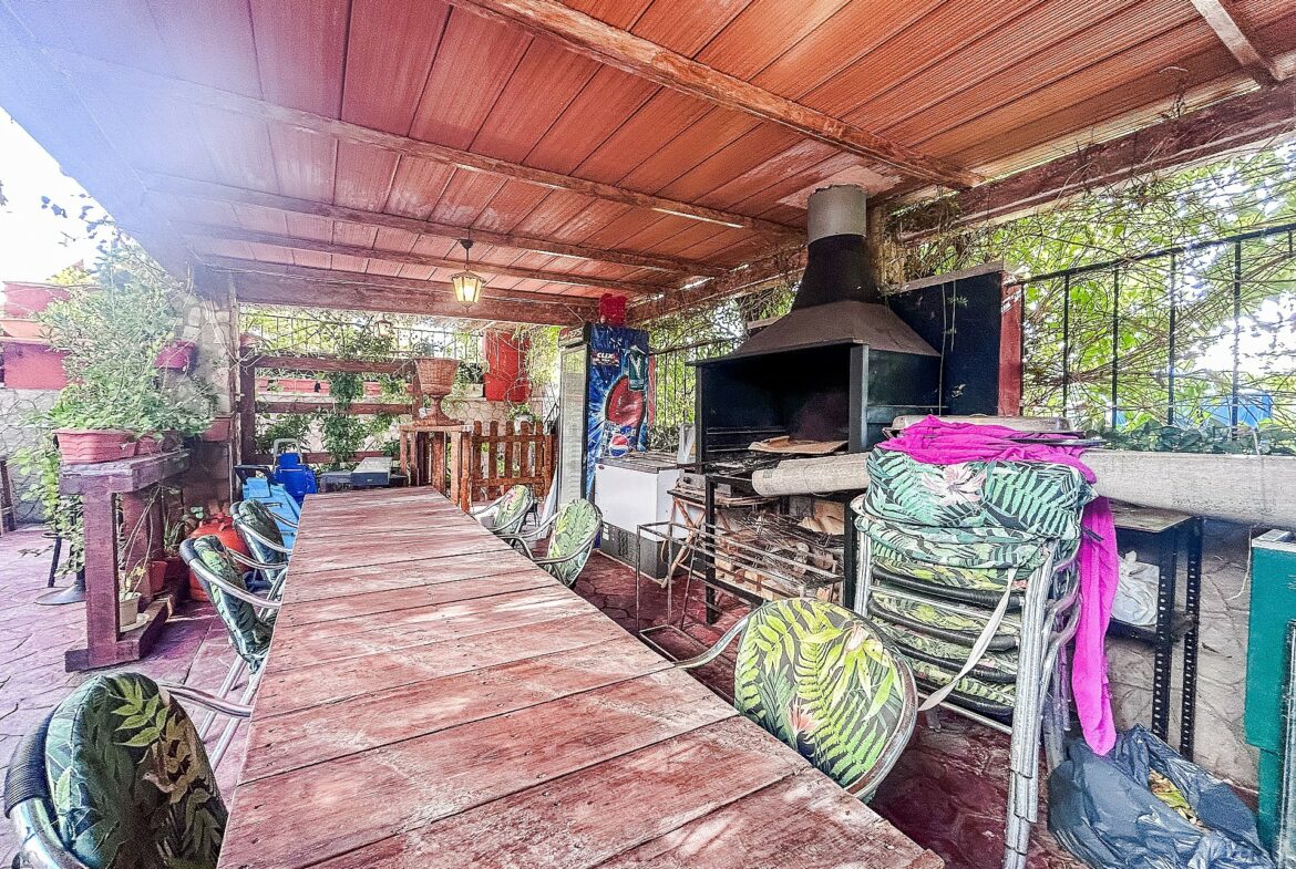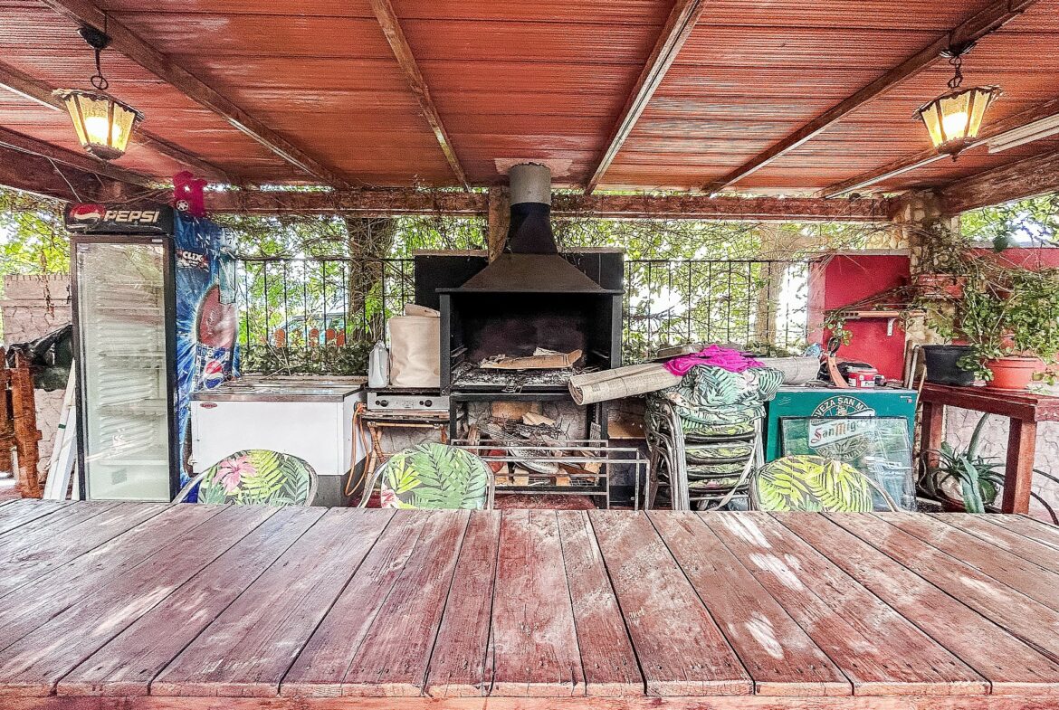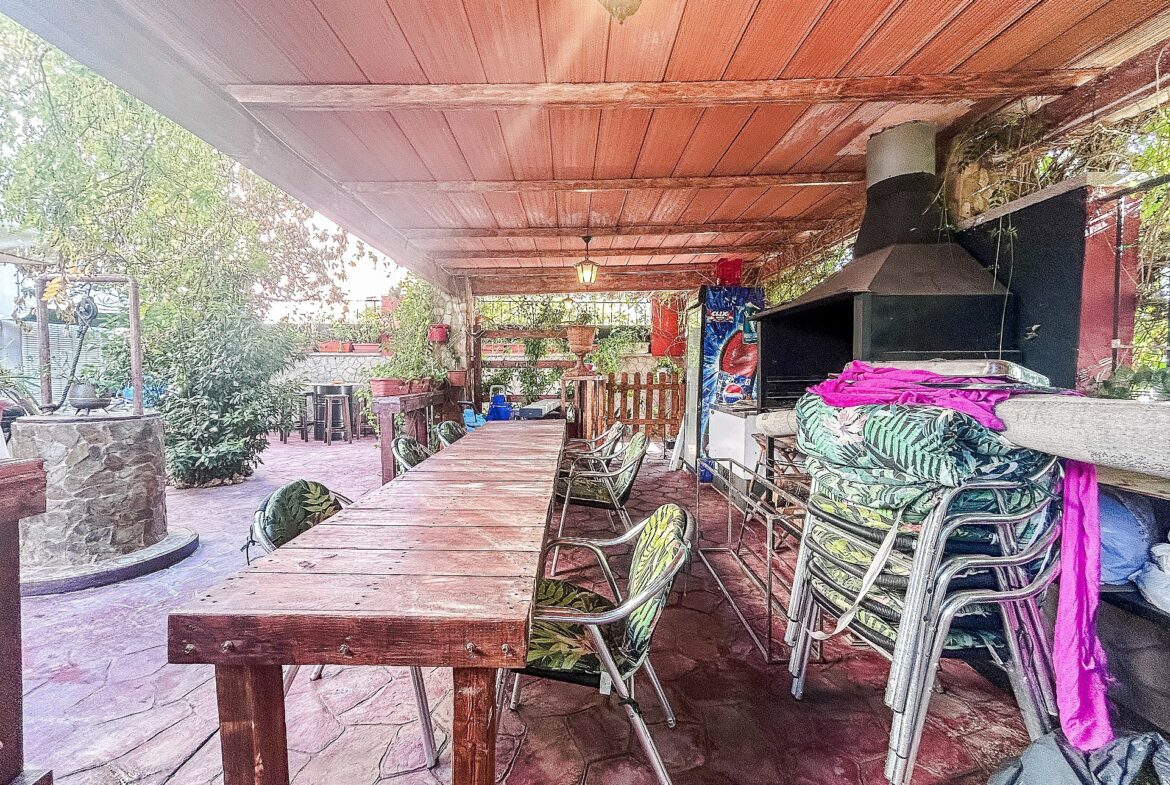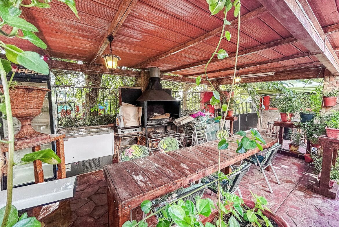 Outdoor areas are an important aspect of this property. A private garage accommodates 2 to 3 vehicles, and a porch with seating creates space for leisure and entertaining, complete with a barbecue area and decorative lighting. The surrounding plot measures approximately 2,000 m², fully fenced for added privacy and security. A courtyard adds to the outdoor value, hosting a second barbecue and a large multipurpose room, which can be transformed into a leisure area, gym, storage space, or studio, depending on needs.