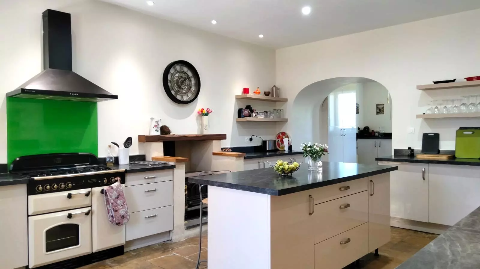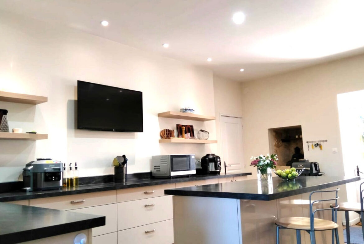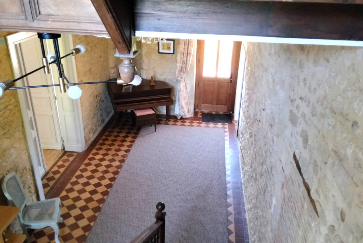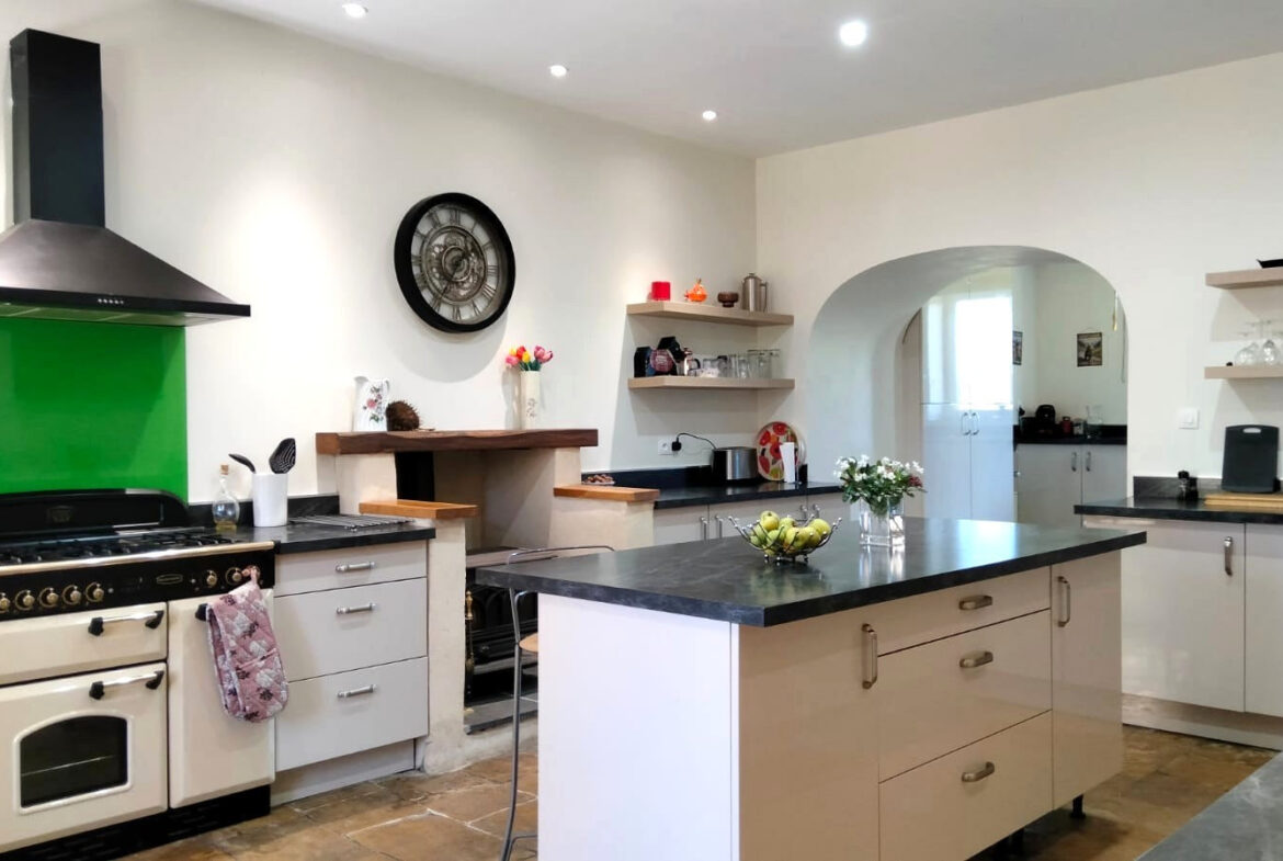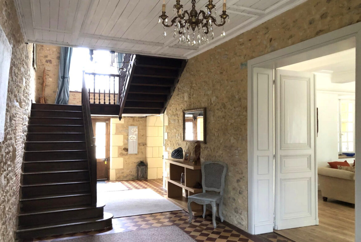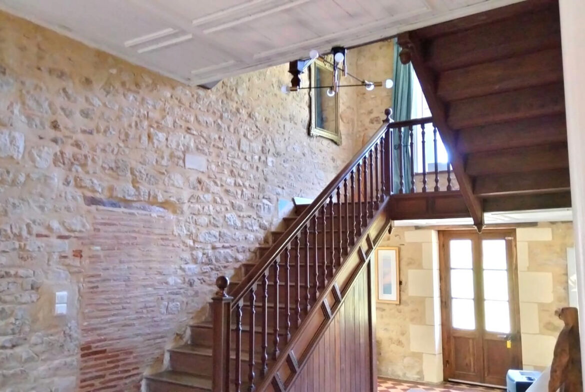 The ground floor welcomes visitors with a grand entrance hallway that leads to an impressive wooden staircase. There are two substantial reception rooms, creating ample space for gatherings or relaxation. A recent kitchen, designed for functionality, and a shower room are also conveniently located on this level. The kitchen includes a central island and offers direct access to a patio area that overlooks the front courtyard.