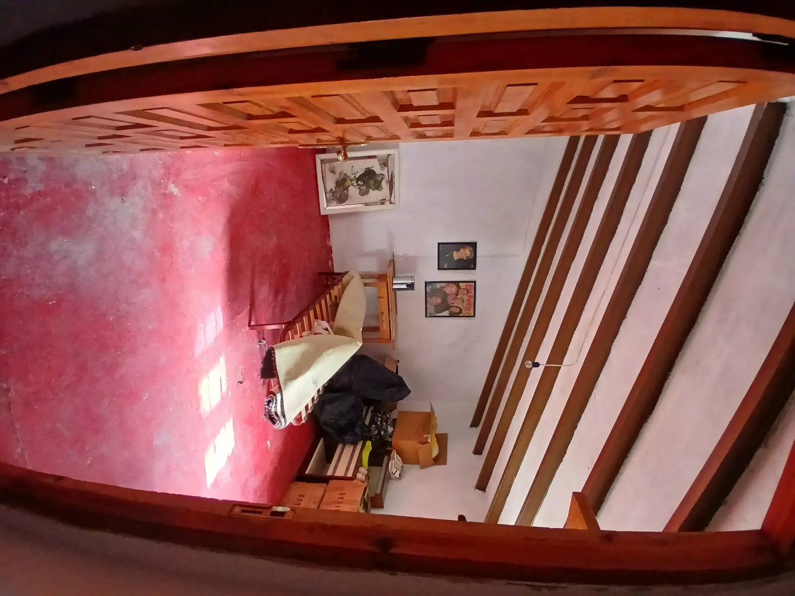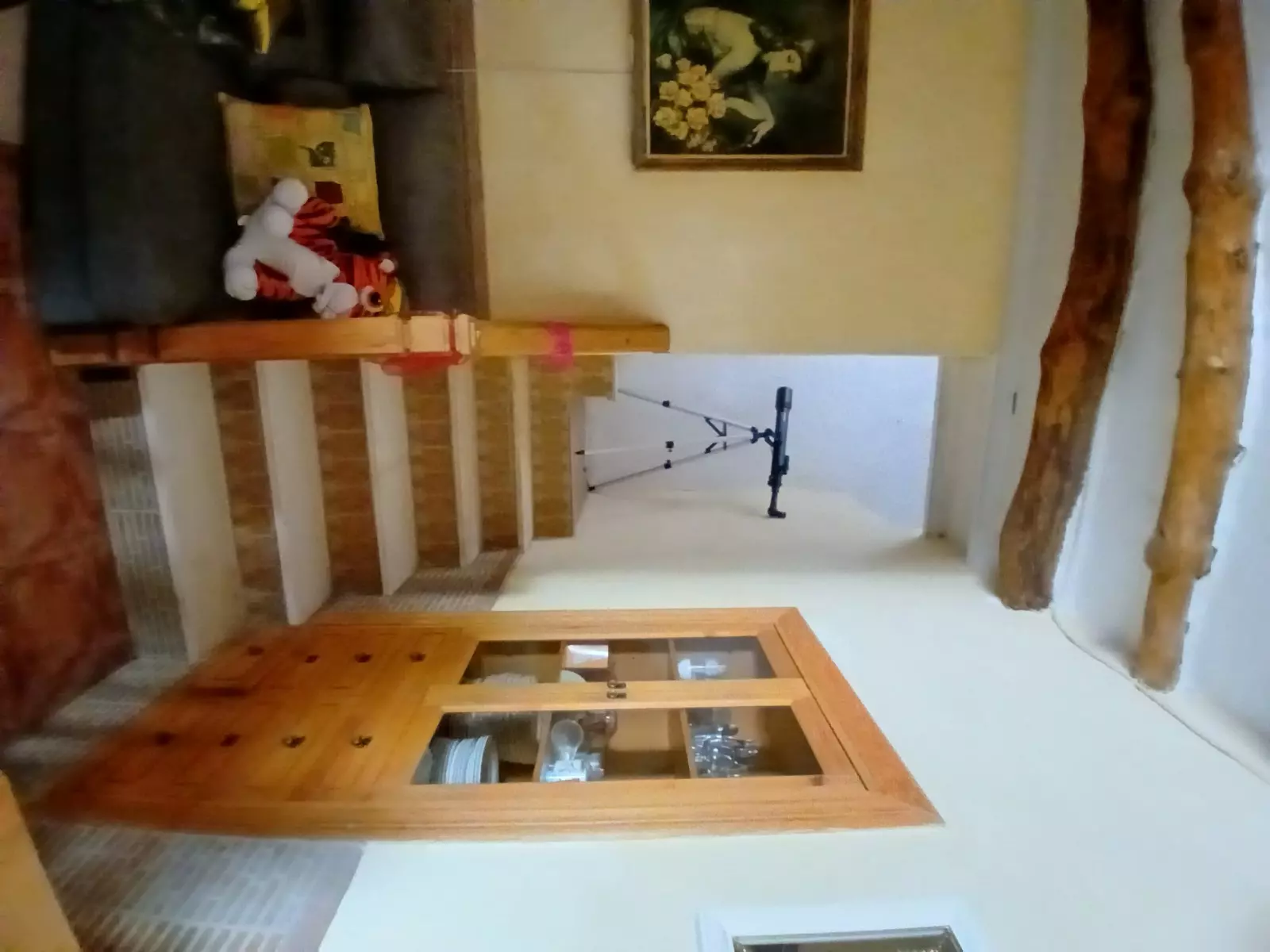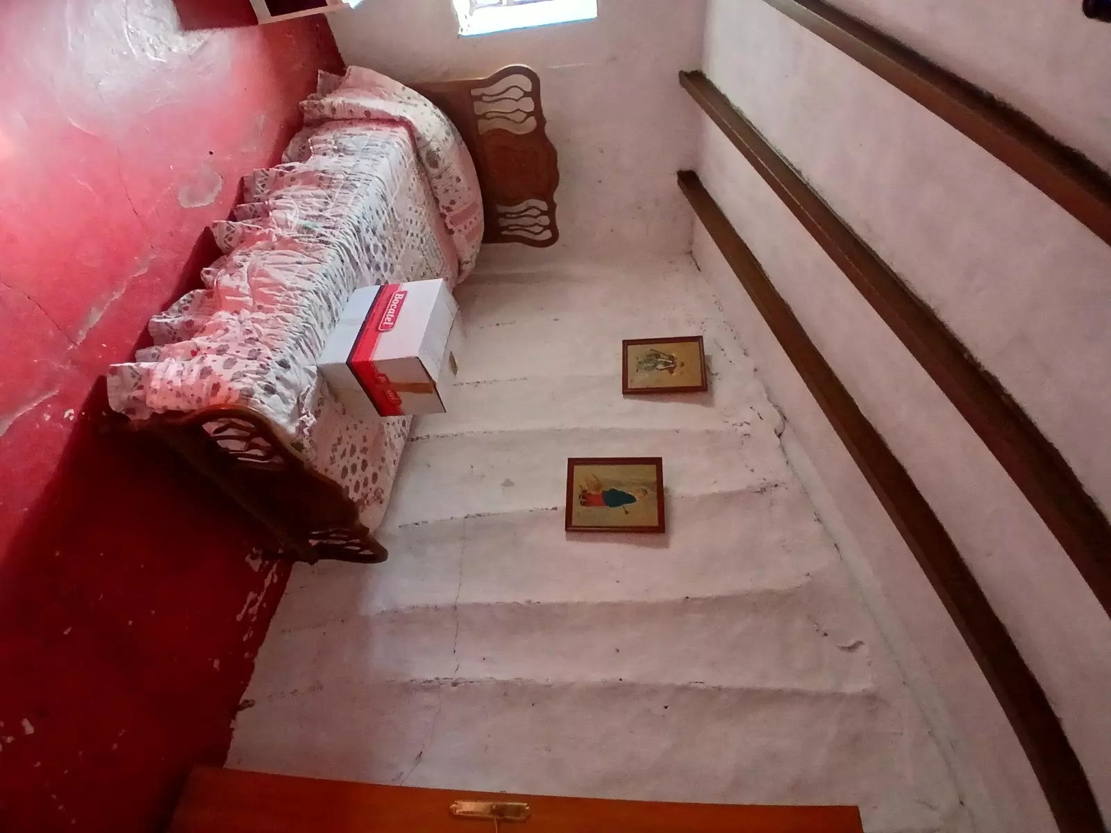The country finca includes a living room with a fireplace and wooden beams, providing a focal point for gatherings. The kitchen is in need of renovation, and the bathroom features a toilet and sink, but currently lacks a shower. On the ground floor, you will find two bedrooms, allowing for immediate accommodation or other usage.