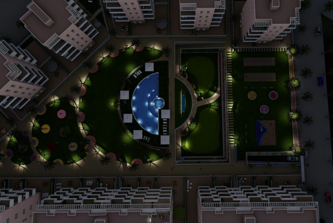 This residential complex is equipped with several amenities for active living. Enjoy the swimming pool, green areas, and golf greens, all designed for relaxation and recreation. Additional features include a spa, playground, bio-healthy machines, and dedicated sports areas, catering to a variety of interests.