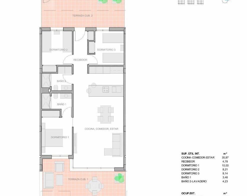 The apartments come with three bedrooms and two bathrooms, offering ample living space. Each unit boasts an open-plan salon and kitchen area, ideal for daily living. Residents can choose from different floors: ground floor apartments include a private garden, middle floor units feature a terrace, and top floor options have a private solarium.