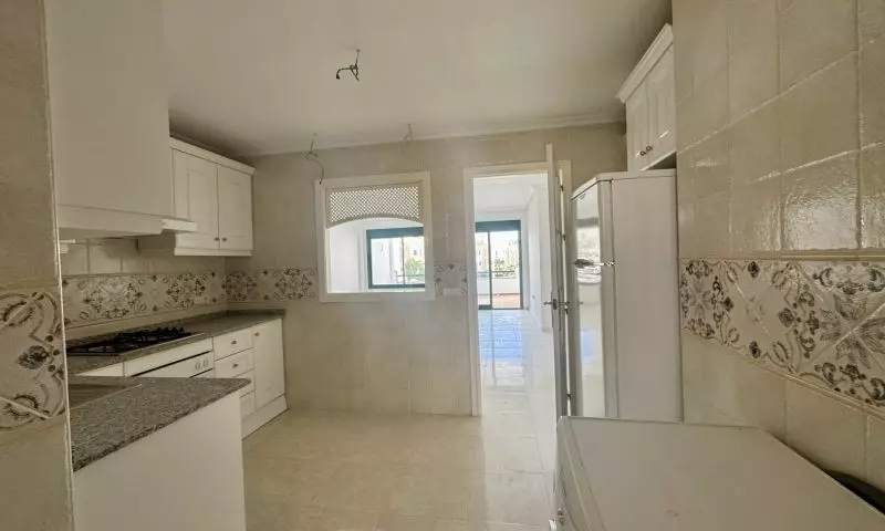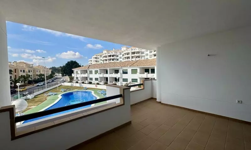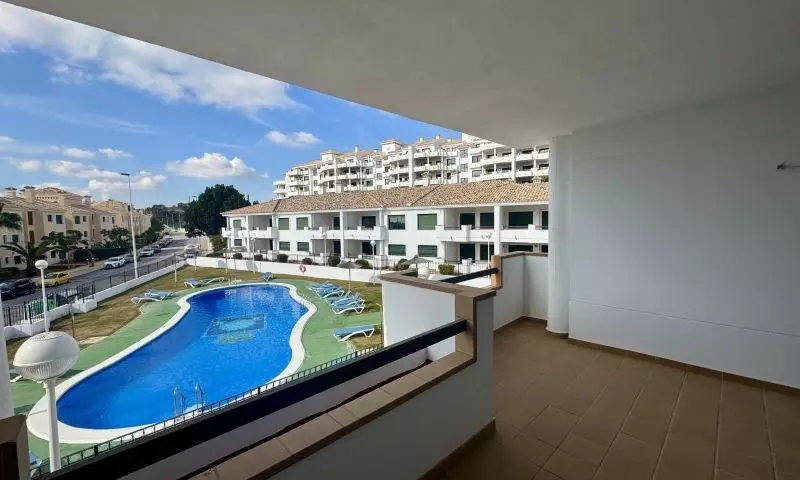 This apartment includes a large terrace that overlooks the pool area. This outdoor space serves as a functional extension of the living area, ideal for enjoying fresh air and outdoor activities. Both bedrooms provide ample room and storage facilities to accommodate various needs.