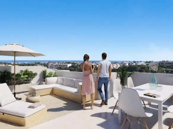 For those considering a new home in a vibrant area, there is a ground floor apartment available in the Naranjo Community, located at Las Colinas Golf & Country Club. This residence was constructed in 2018 and features a south-facing orientation, ensuring ample natural light throughout the day.