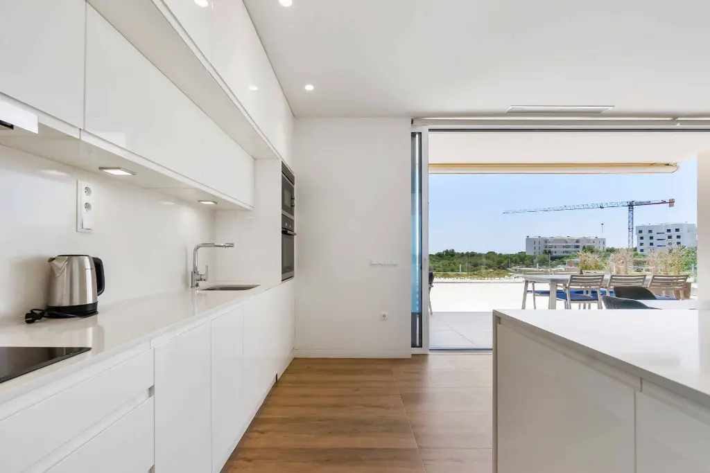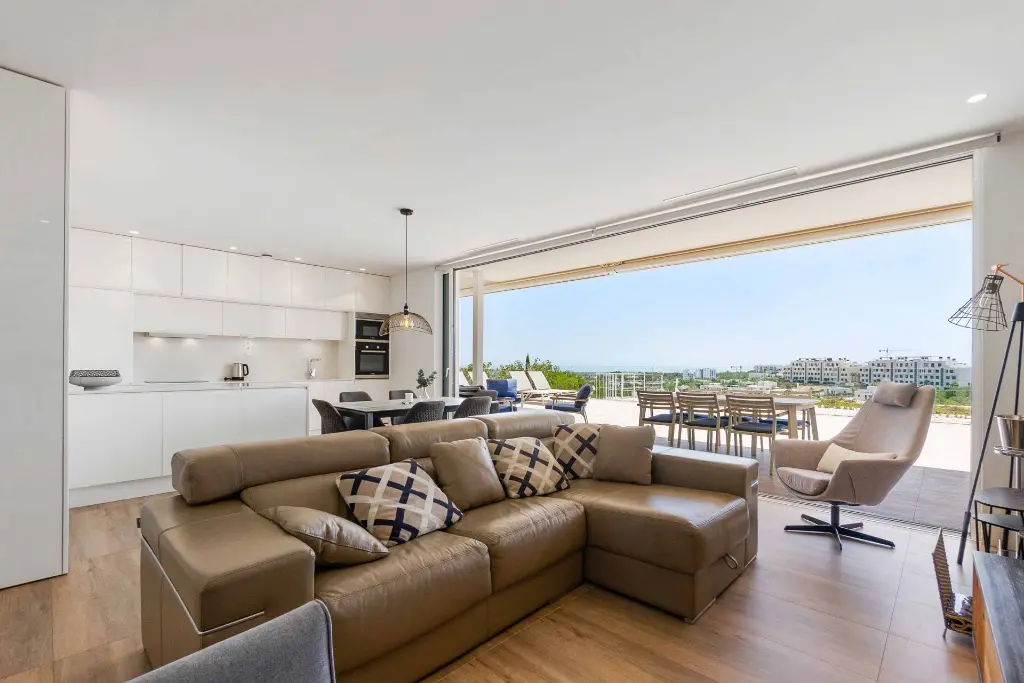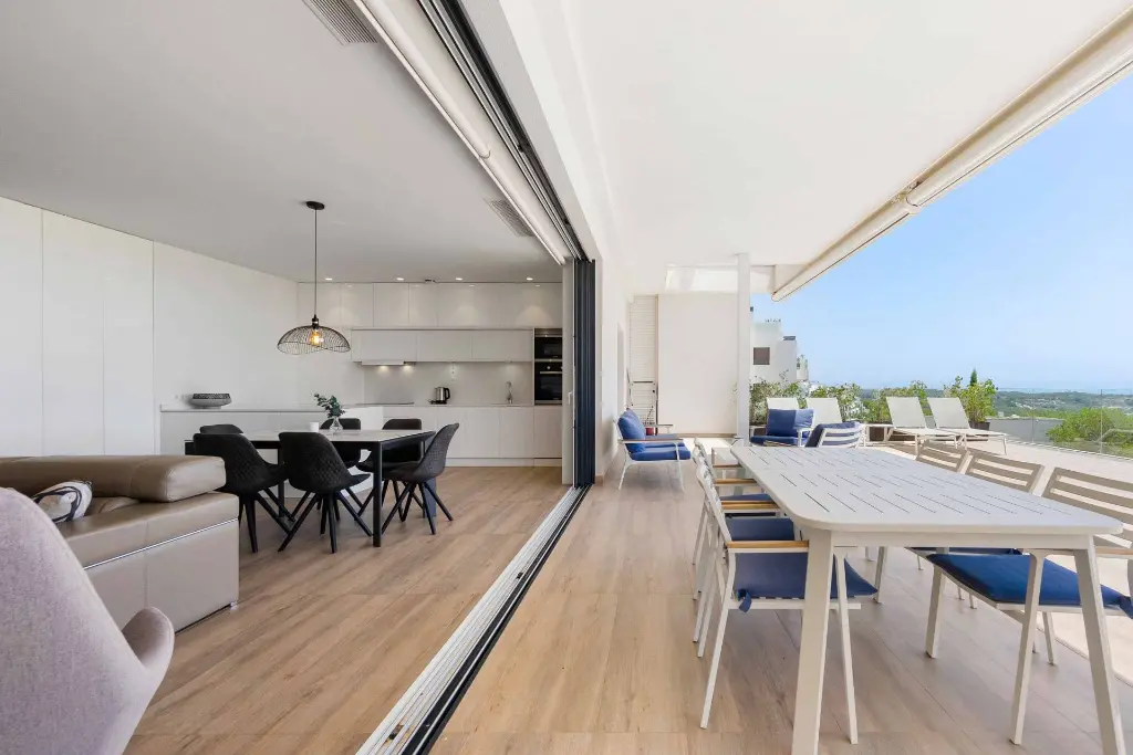Upon entering the apartment, you will find the living room and kitchen to your right. The layout flows seamlessly, making it easy to navigate between spaces. A standout feature of this apartment is the impressive 110 square meter south-facing terrace, accessible from the living area. Large sliding windows, which disappear completely into the walls, create a connection between indoor and outdoor spaces.