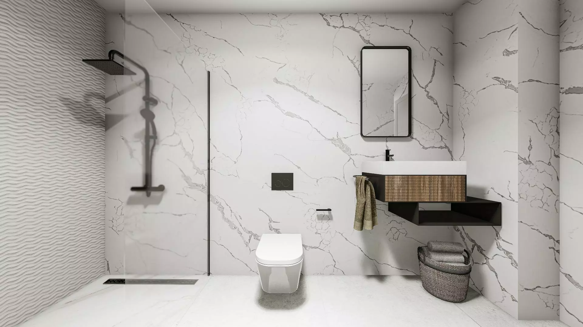 - Bathrooms featuring countertop sinks, single-lever taps, and safety glass screens