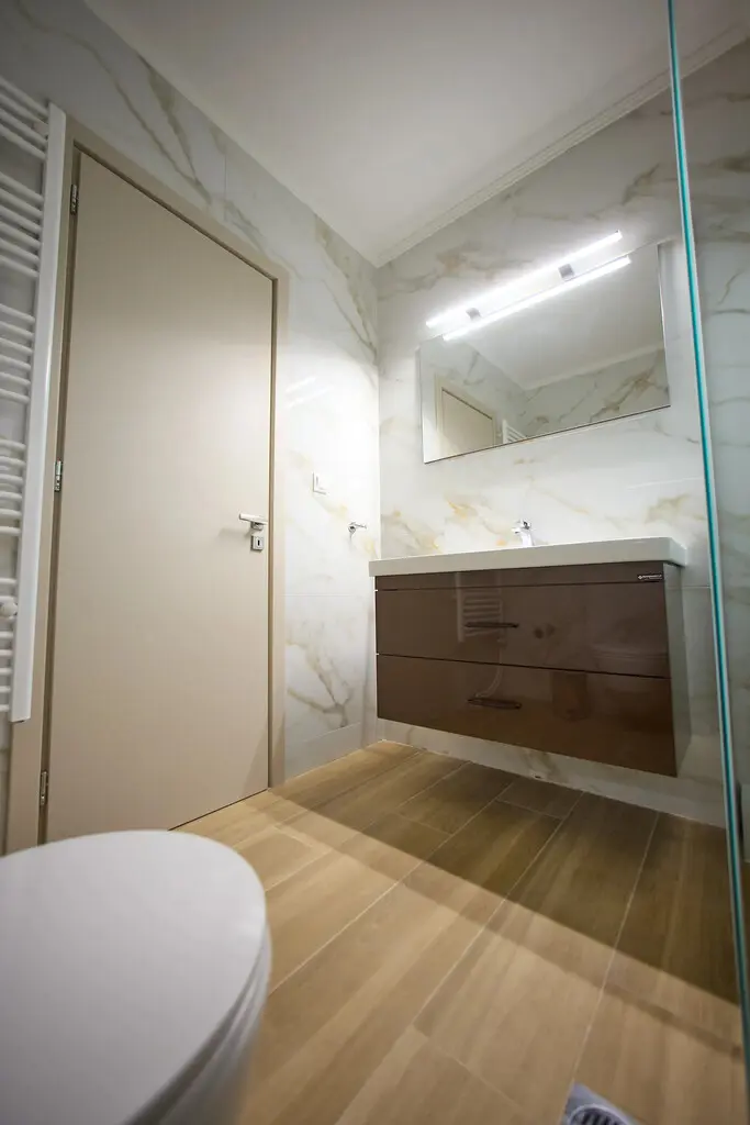 For hygiene and convenience, there is one shower WC and an additional WC included in the apartment layout. The front layout of the unit ensures that the main living areas receive natural light, enhancing the overall atmosphere of the living space.