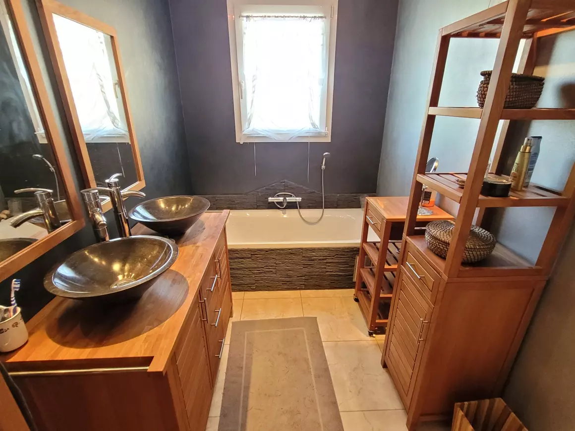 On the ground floor, you will find a 50 m2 living/dining room equipped with a fireplace, along with a 13.5 m2 fitted kitchen that includes a hob, extractor hood, electric oven, dishwasher, and ample storage units. Additional space includes a 6 m2 storeroom, a 4 m2 hall, and a 5 m2 bathroom with two basins and a bathtub. A bedroom measuring 14 m2 and a workshop of 14 m2 lead into another 31 m2 workshop that provides rear access, along with a 23 m2 garage.
