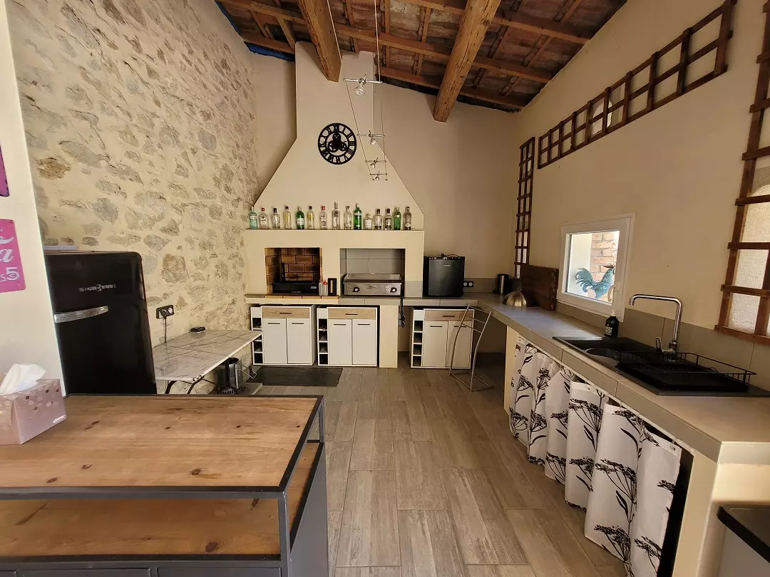 The exterior includes a sunny courtyard and a generous 230 m² rear garden, which is home to a heated saltwater swimming pool measuring 8 by 4 meters. The pool is equipped with an electric rolling cover for convenience. Additionally, a stone summer kitchen provides an outdoor cooking area, perfect for gatherings and entertaining.