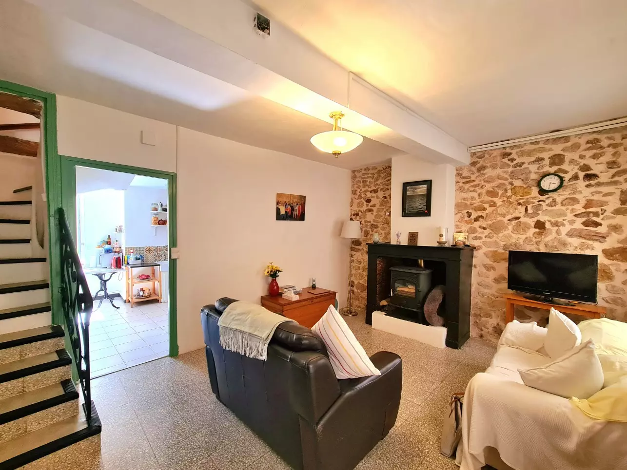 Upon entering, you are greeted by a lounge measuring 19.82 m², featuring a wood-burning stove and an attractive exposed stone wall. The kitchen, sized at 18.23 m², includes a sink and working area for food preparation. There’s also a practical laundry room of 10.90 m² accessible from outside, and a cellar/workshop of 30 m², which could be converted into a guest unit or gîte.