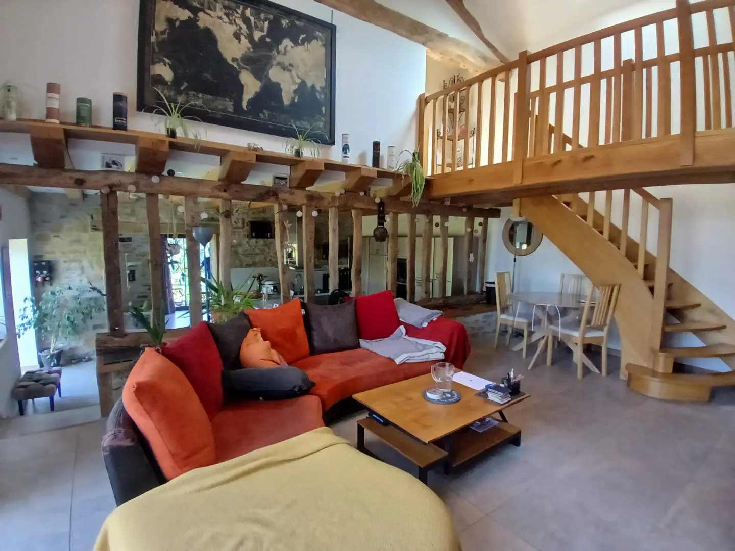 This property, originally converted from a barn, offers unique features and is built to a high standard. It includes a fully equipped kitchen, a dining room with access to a terrace, a living room with a wood burner, two bathrooms, and three bedrooms. The original house is attached and fully self-contained, with its own living room, bedroom, and bathroom.