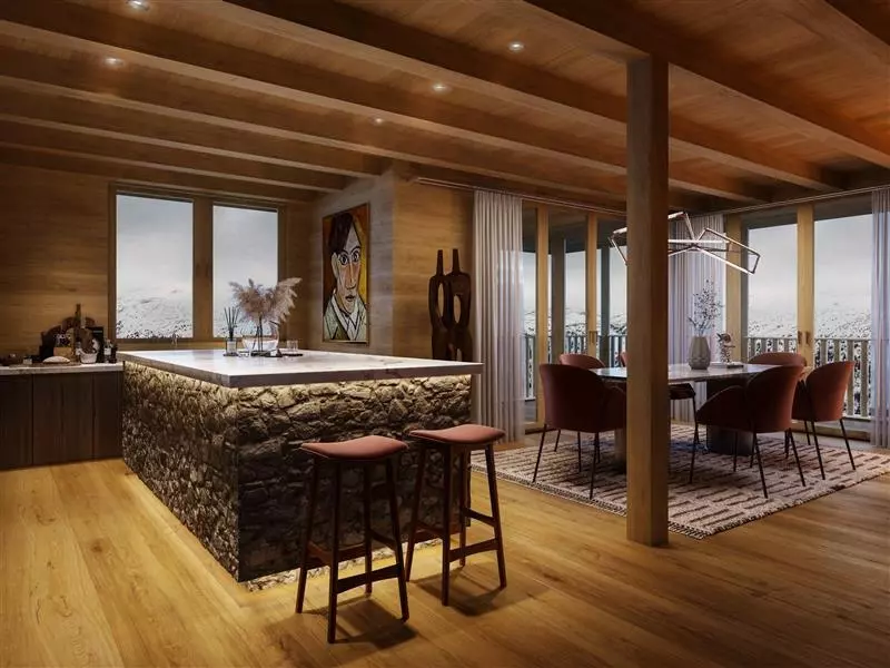 The architectural style of these apartments features traditional chalet design elements, combining wood and local stone facades. The exterior is not only visually appealing, but also designed to blend with the local environment. Outside space is also considered, offering residents areas for relaxation and enjoyment in the alpine setting.