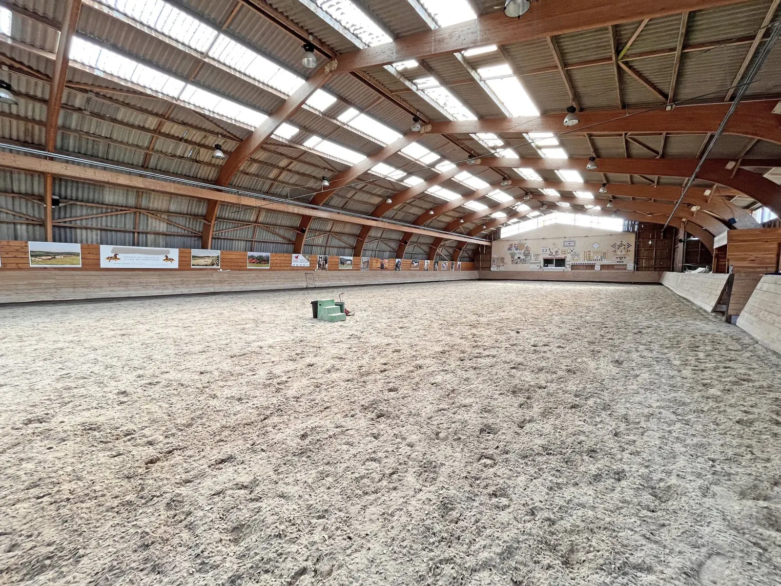 The equestrian facilities are designed to support both training and breeding activities. A 30×60 m outdoor riding arena and a 20×60 m indoor riding arena equipped with a clubhouse provide riders with ample space for practice. For horse care, there is a horse walker that accommodates eight horses, a lunging circle, and 72 stalls with heated drinking troughs. Moreover, two open stables equipped with surveillance cameras enhance the security of the animals.