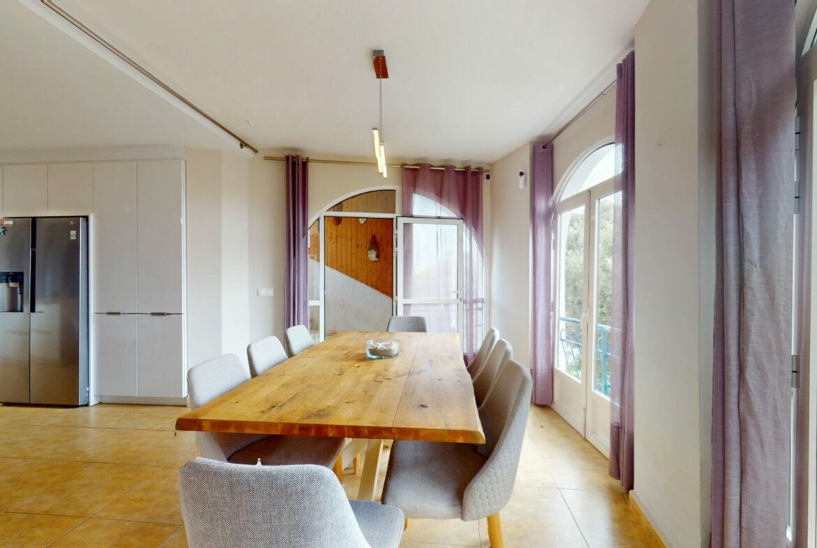 The exterior of the villa features a large private pool, which offers a refreshing retreat during the warmer months. Sun terraces surround the pool, providing ample space for sunbathing or outdoor activities. A well-maintained garden contributes to the overall appeal, offering a serene place to unwind while enjoying the Mediterranean climate.