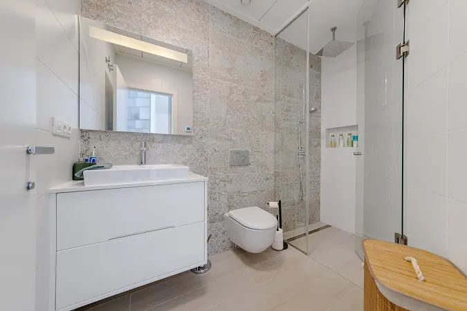 The kitchen is fitted in a modern white design, flowing seamlessly into the living area for a minimalist look. The property includes two double bedrooms, each with built-in wardrobes for storage. The master bedroom comes with an en-suite shower room, while a second shower room serves the rest of the apartment.