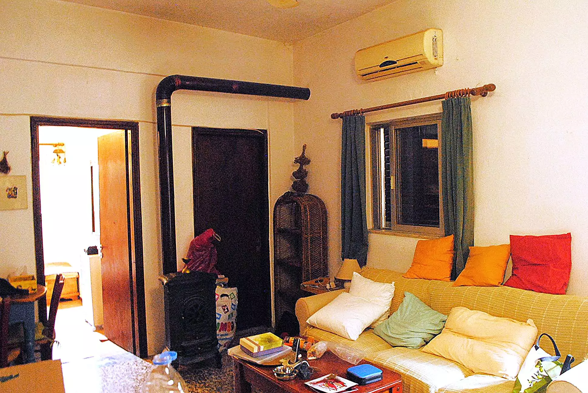 Open plan living room/kitchen with fireplace and AC/warm air unit.