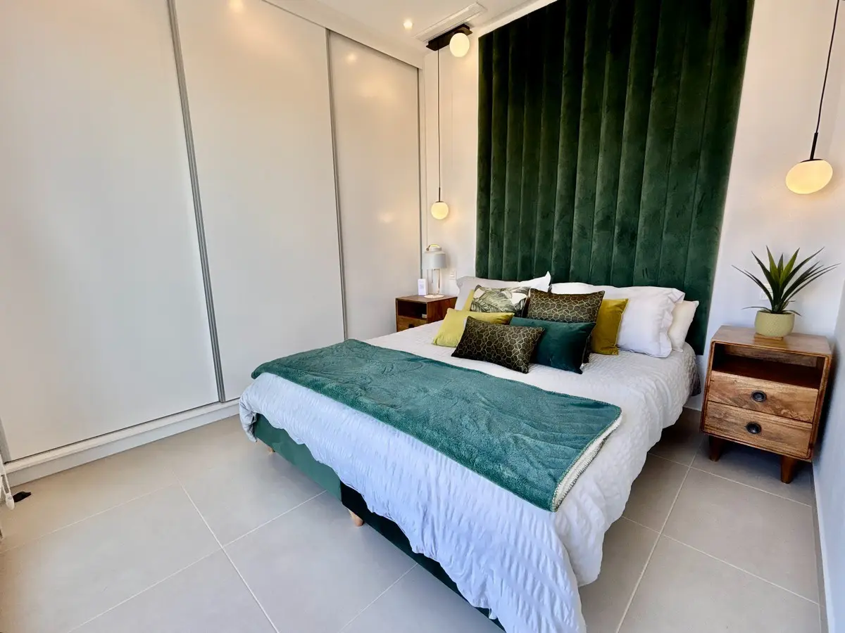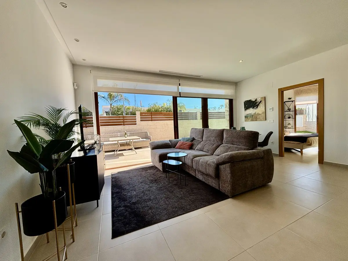 The villa includes a bright lounge and dining area, complete with air conditioning. This space opens to the garden through double glazed sliding doors. The kitchen is open-plan and fully fitted, accompanied by a separate utility room. Each of the three double bedrooms features built-in wardrobes, air conditioning, and an en-suite bathroom or shower room. The ground floor bedroom offers direct garden access, while a first-floor bedroom includes sliding doors leading to a private solarium. Additionally, a ground floor toilet is available for convenience.