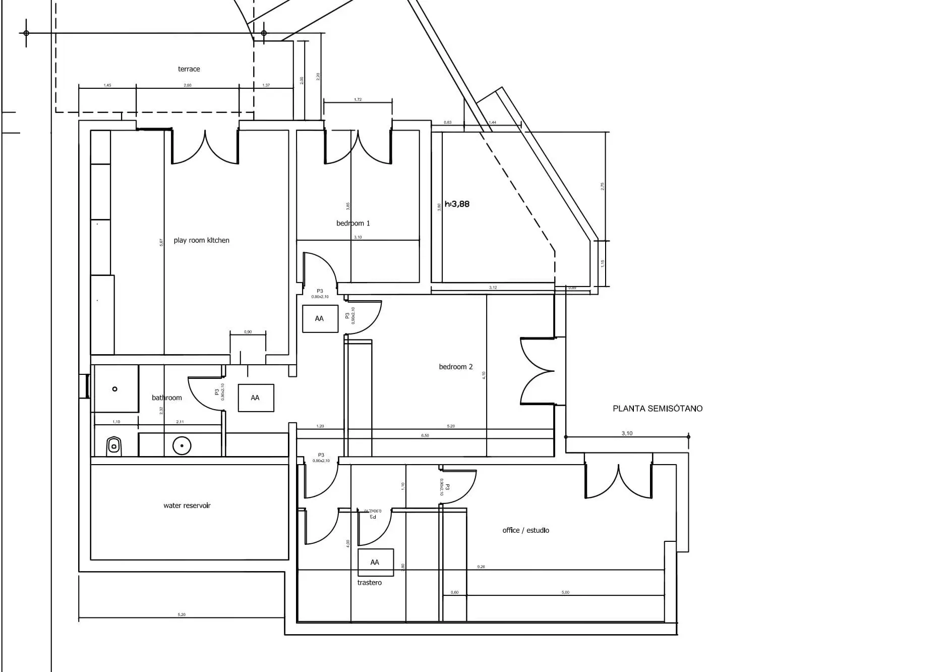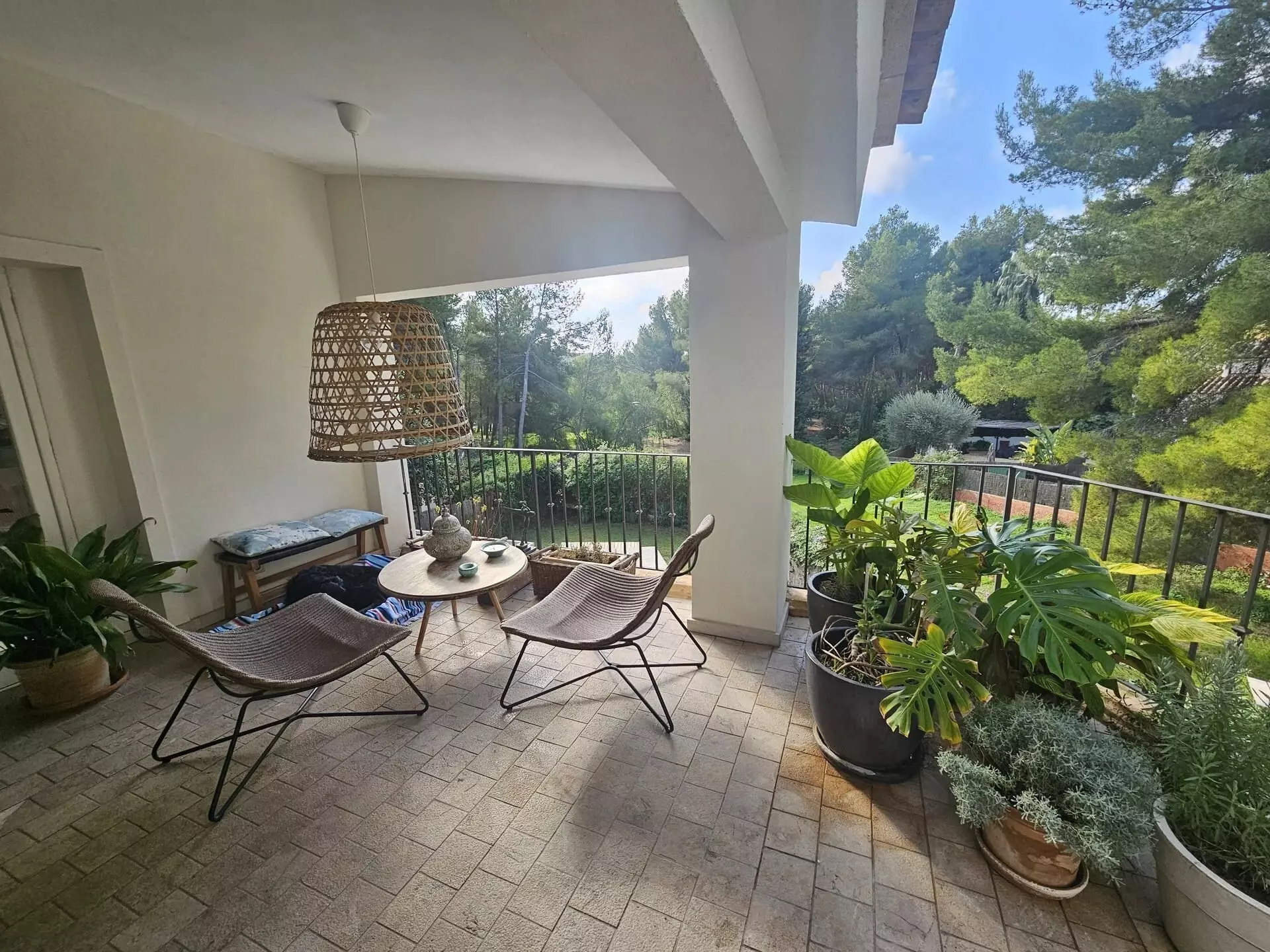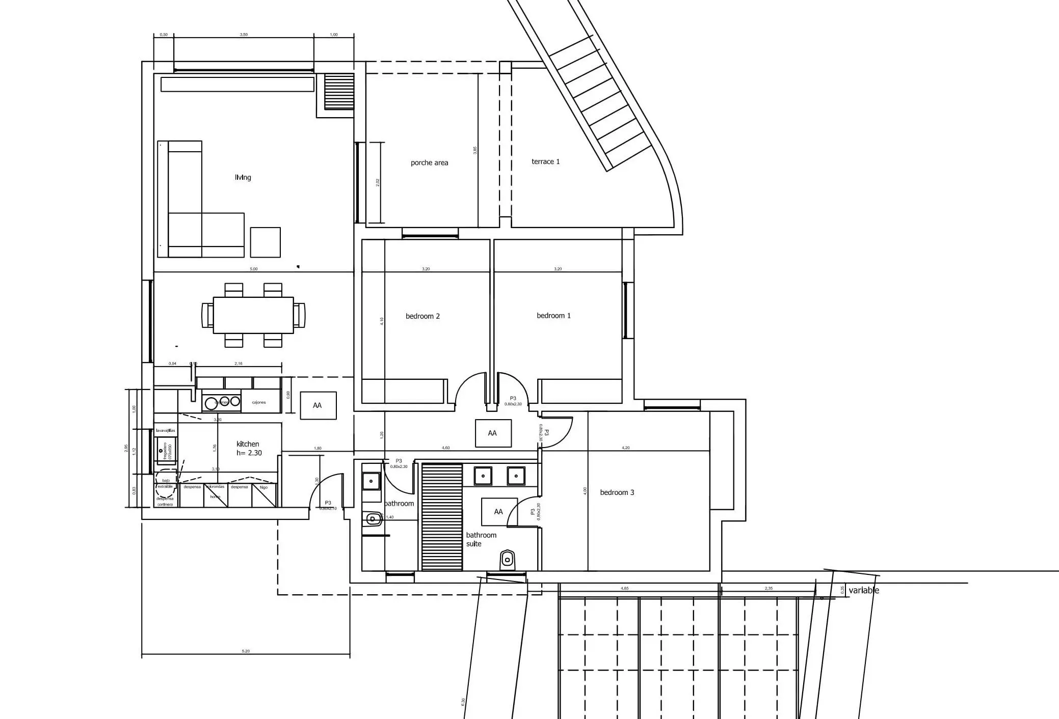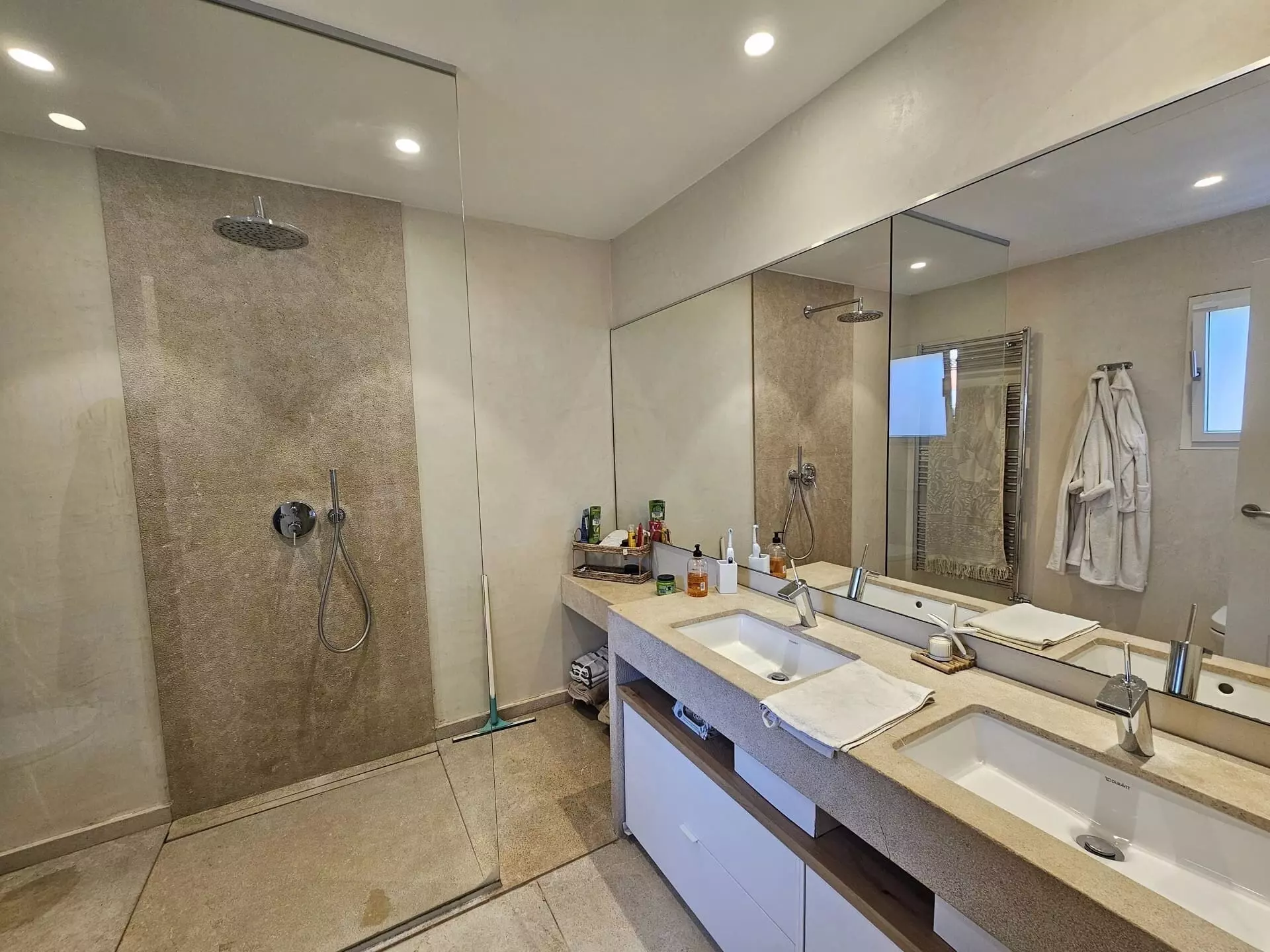 The villa spans two levels, designed to meet a variety of family needs. The upper floor features a spacious lounge area, a fully equipped open plan kitchen, and a dining area that connects to a covered porch. This outdoor space offers views of the garden and swimming pool. Additionally, this level contains three bedrooms and two bathrooms, including one ensuite.