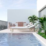 The villa spans two levels, designed to meet a variety of family needs. The upper floor features a spacious lounge area, a fully equipped open plan kitchen, and a dining area that connects to a covered porch. This outdoor space offers views of the garden and swimming pool. Additionally, this level contains three bedrooms and two bathrooms, including one ensuite.