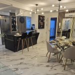 – Modern fitted kitchen, comprising of a range of base units with granite work surface and a range of wall units above.