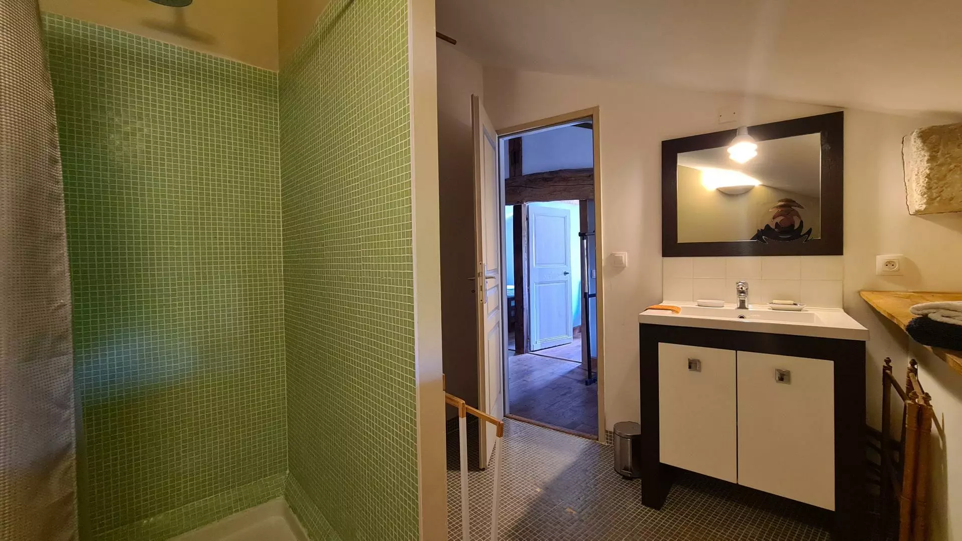 The staircase is constructed with traditional terracotta tiles, leading to the first floor. Here, you will find four bedrooms alongside a shower room, a bathroom, and a separate WC. This arrangement allows for privacy and convenience for residents and guests alike. Each room accommodates a variety of furniture arrangements and storage solutions to suit different needs.