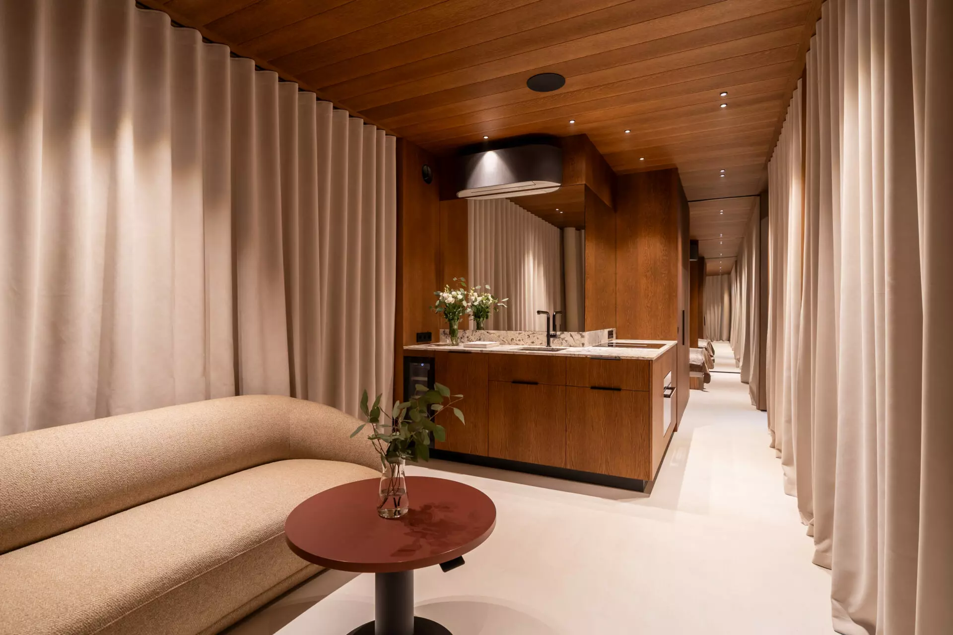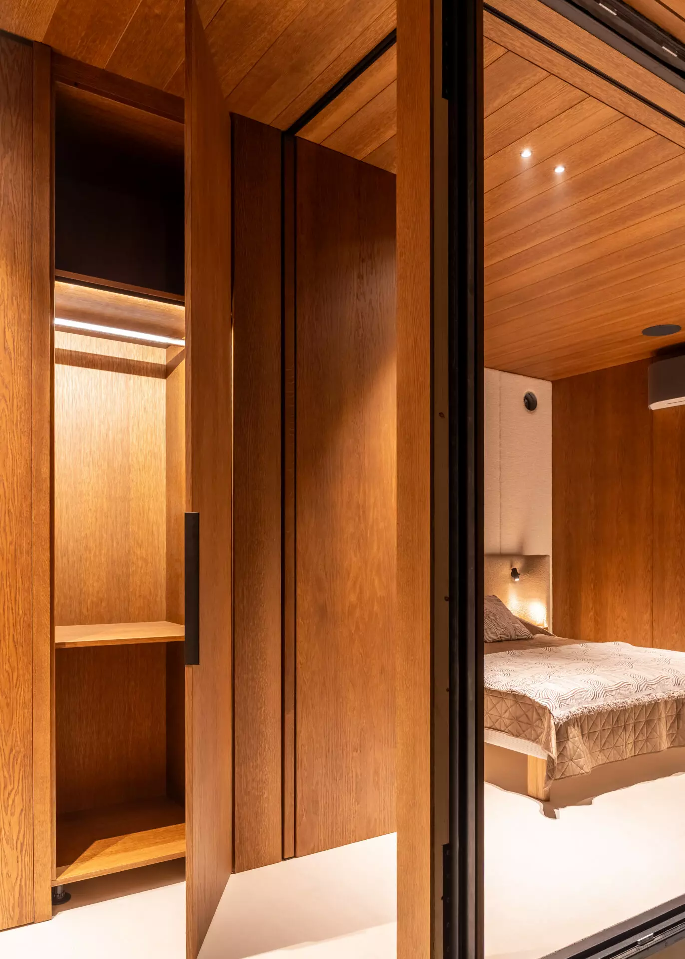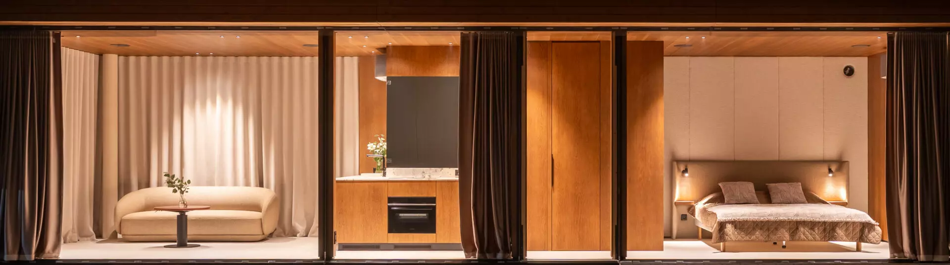 The 13 x 3.2m cabin includes a fully equipped private bedroom with bespoke built-in oak furniture, an open living space with BoConcept sofa and a fully equipped studio kitchen with Siemens premium appliances. Large panoramic triple-glazed Saint-Gobain StopSol glass wraps the interior in a 270-degree view, pulling natural light and landscape deep into the space.