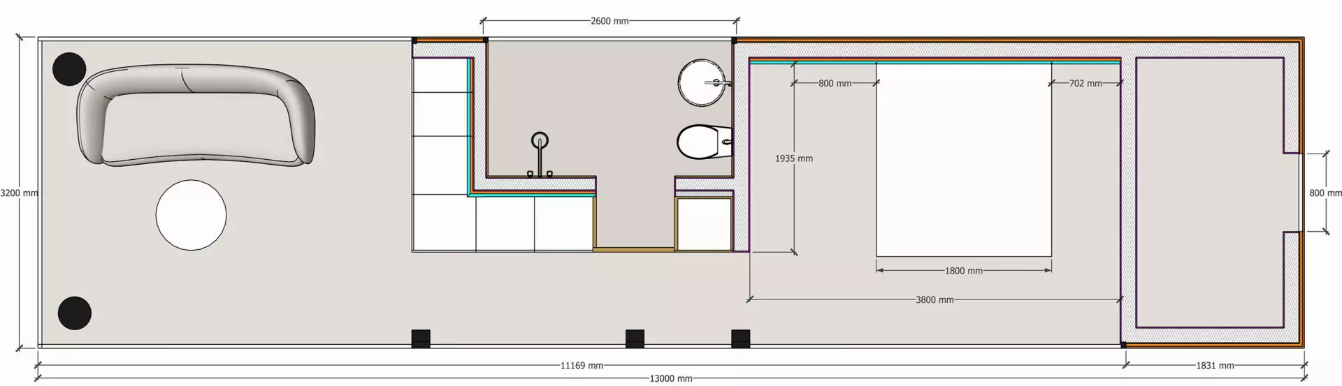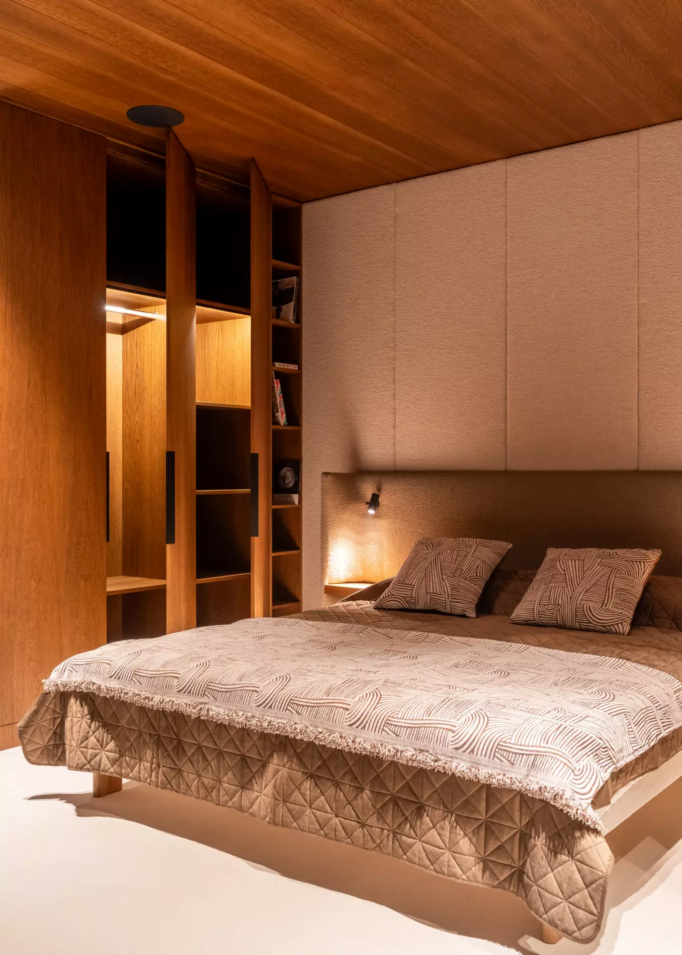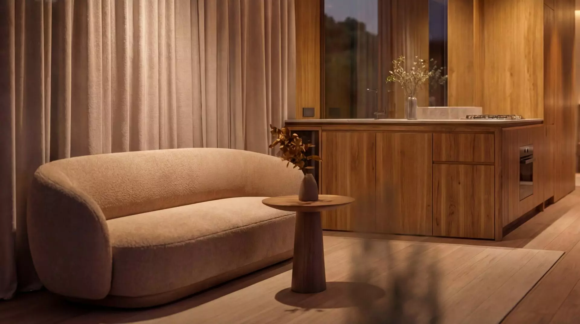 The 13 x 3.2m cabin includes a fully equipped private bedroom with bespoke built-in oak furniture, an open living space with BoConcept sofa and a fully equipped studio kitchen with Siemens premium appliances. Large panoramic triple-glazed Saint-Gobain StopSol glass wraps the interior in a 270-degree view, pulling natural light and landscape deep into the space.