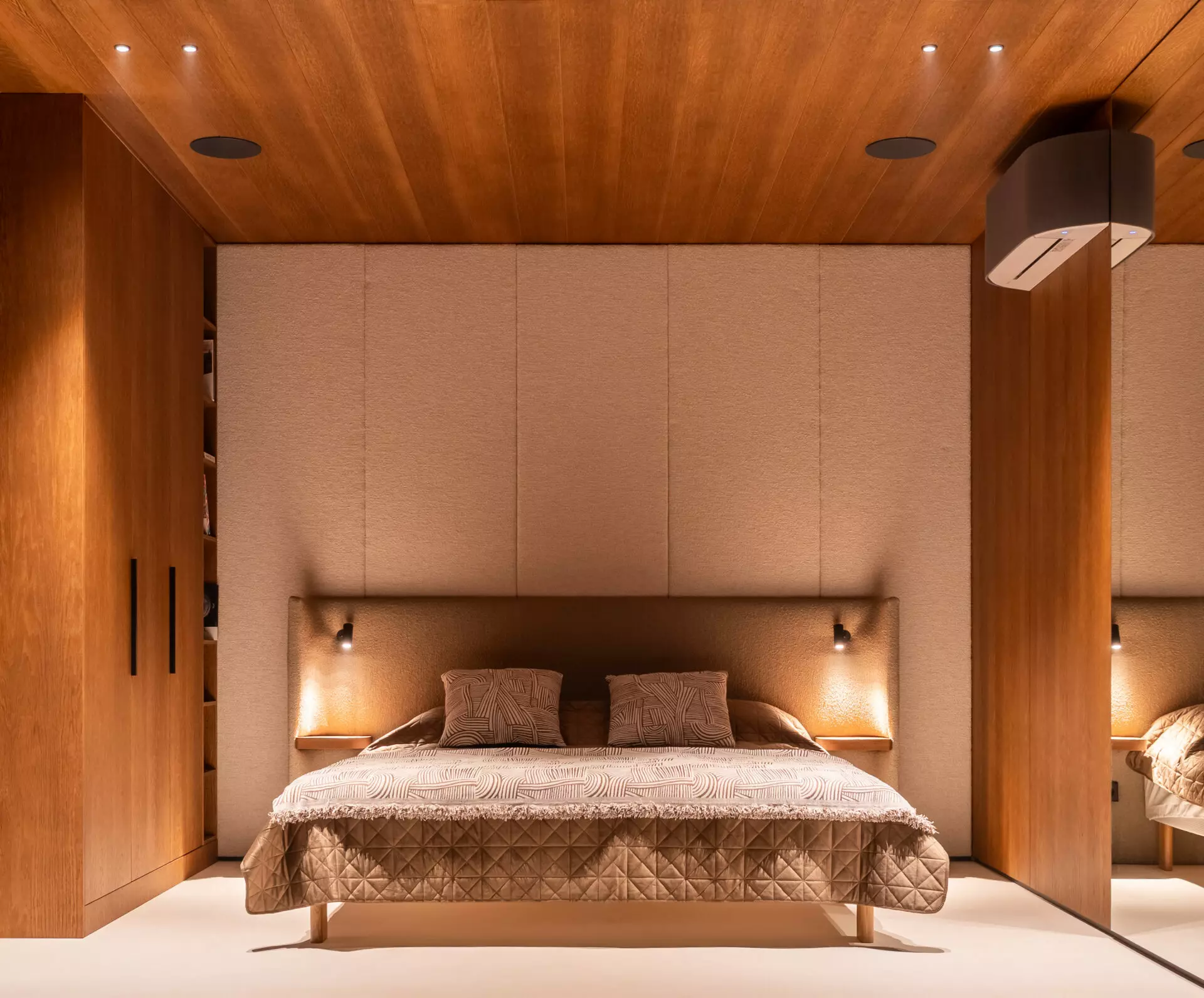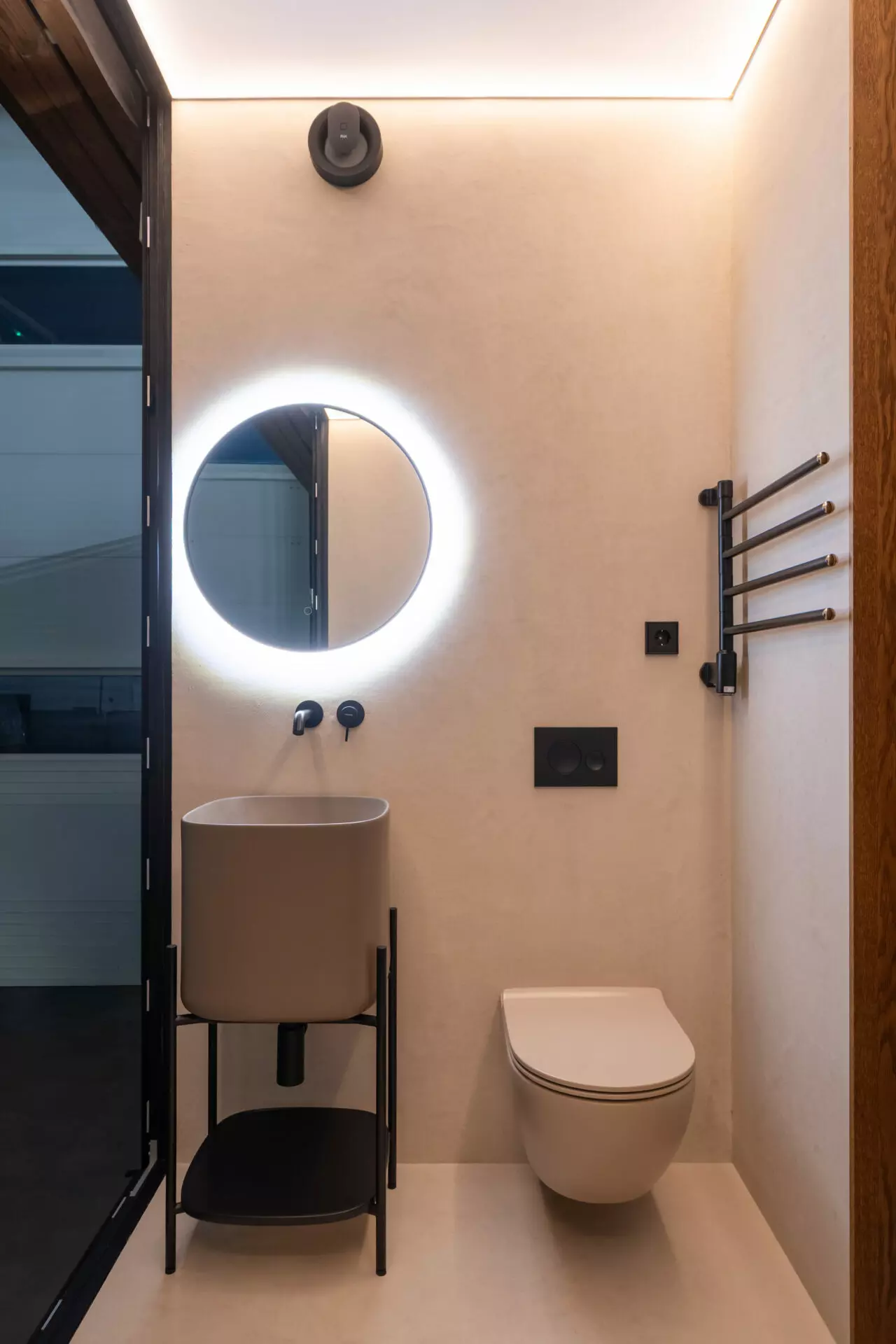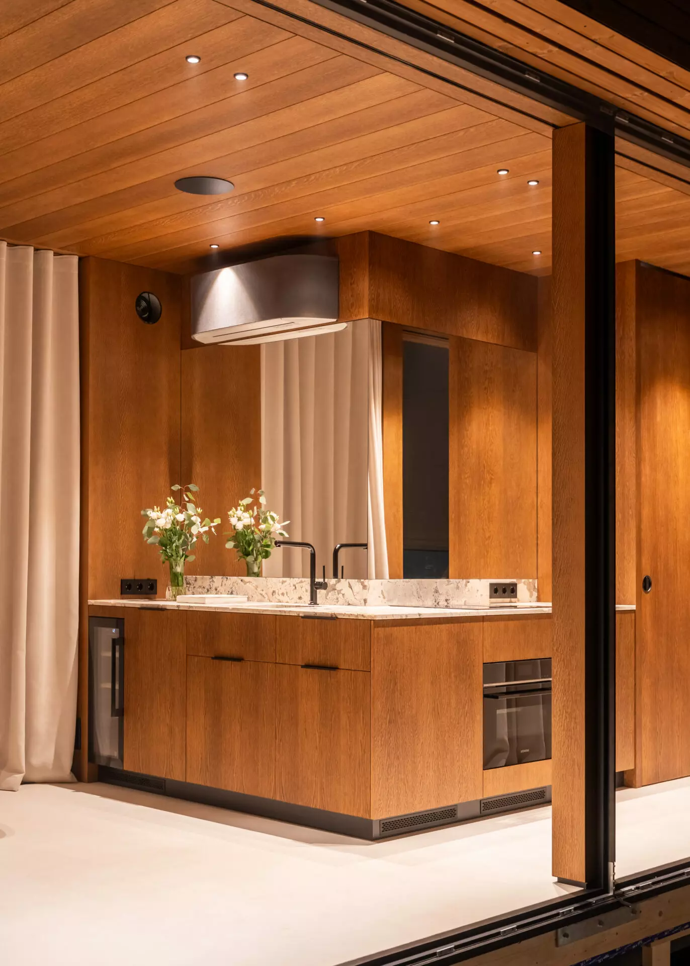 Interior finishes include limestone floors and oak veneer wall panels. The bathroom is fitted with Hansgrohe and Villeroy & Boch fixtures. Integrated Flos lighting, Toshiba climate control, infrared heated floors and a smart home system built on Siemens, Shelly and Homey automation with JUNG kinetic switches complete the interior.