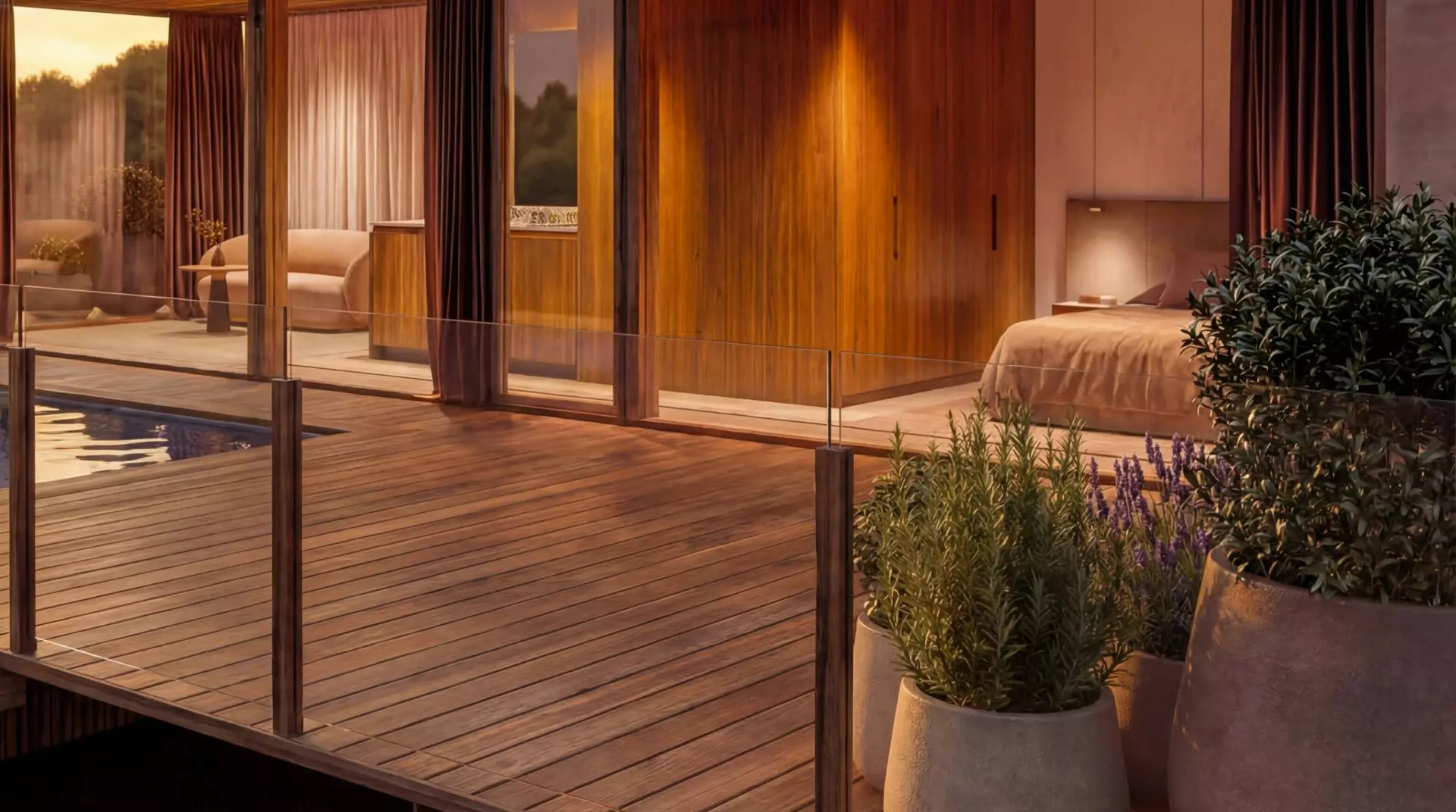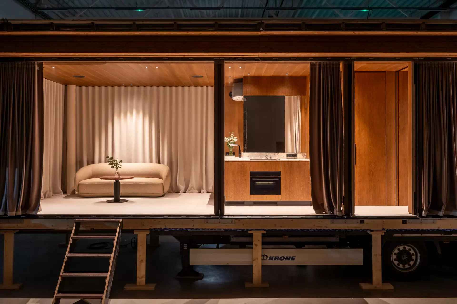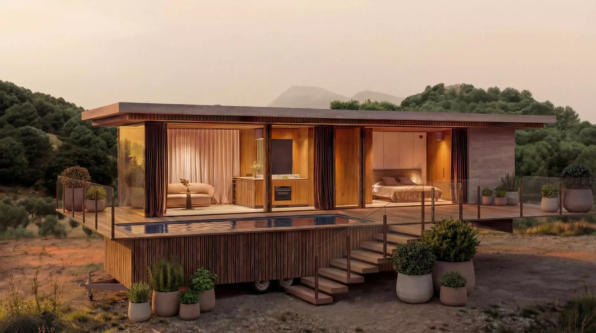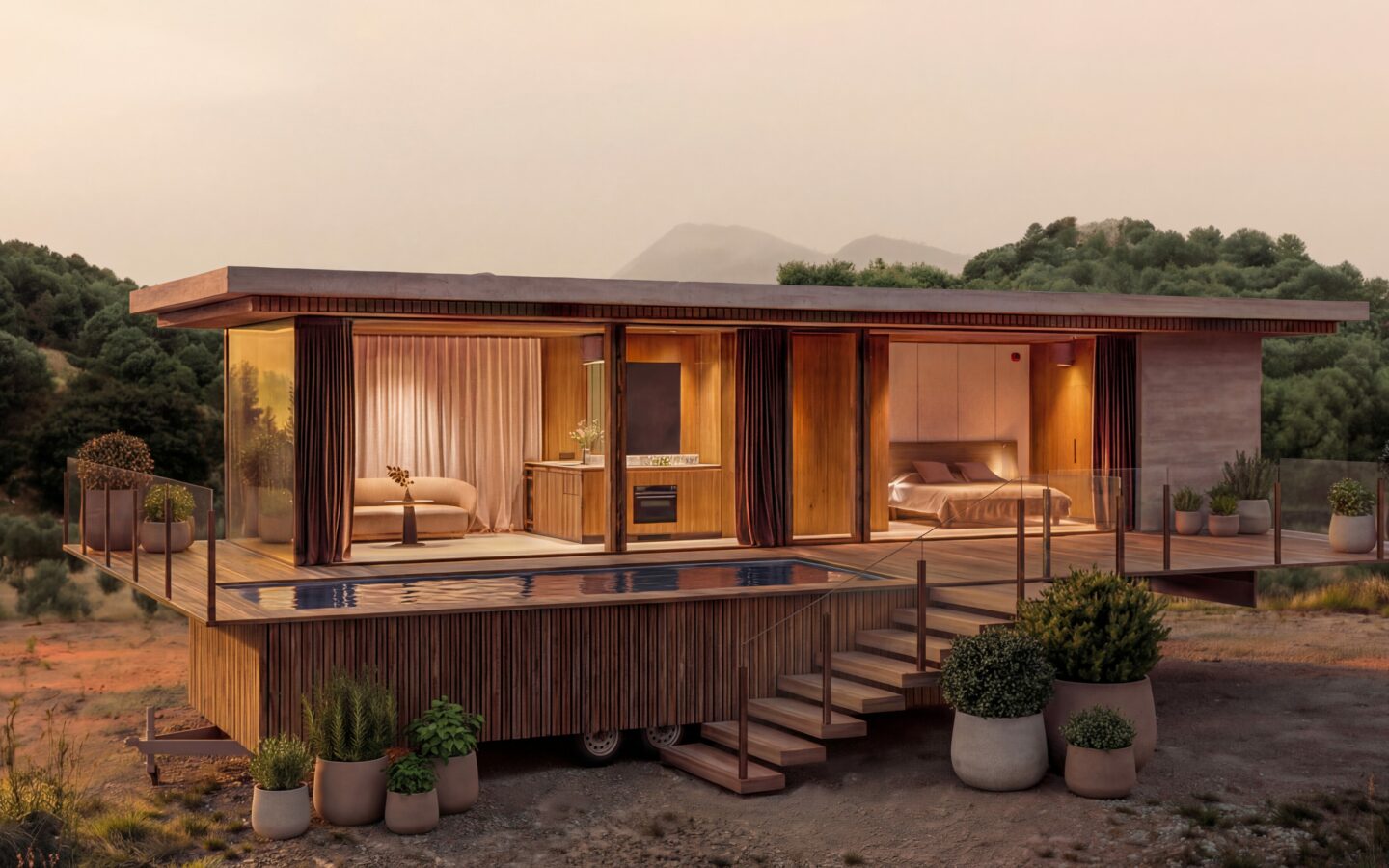 This unit includes a separate mobile infinity pool module mounted on its own trailer platform. The pool connects to the cabin through a thermally modified timber terrace deck, creating a complete outdoor living environment. Both modules travel independently and can be relocated together at any point.