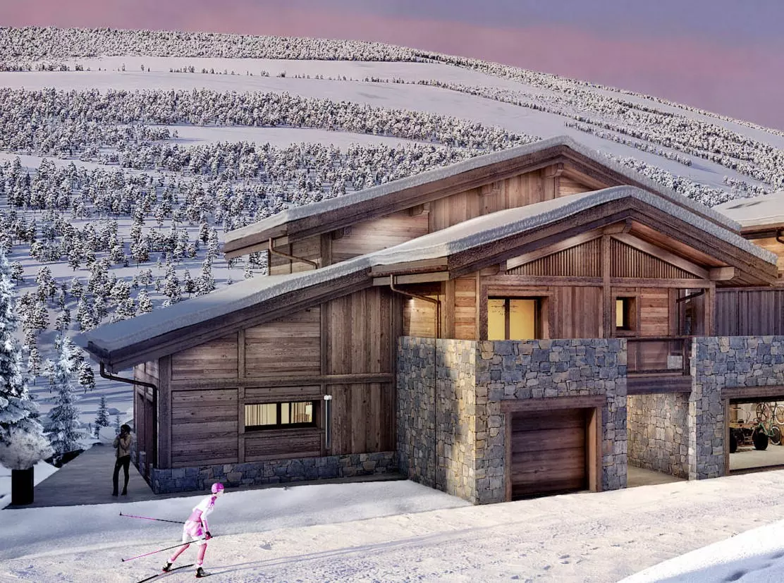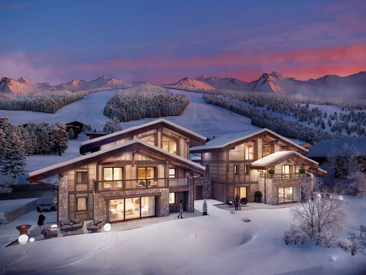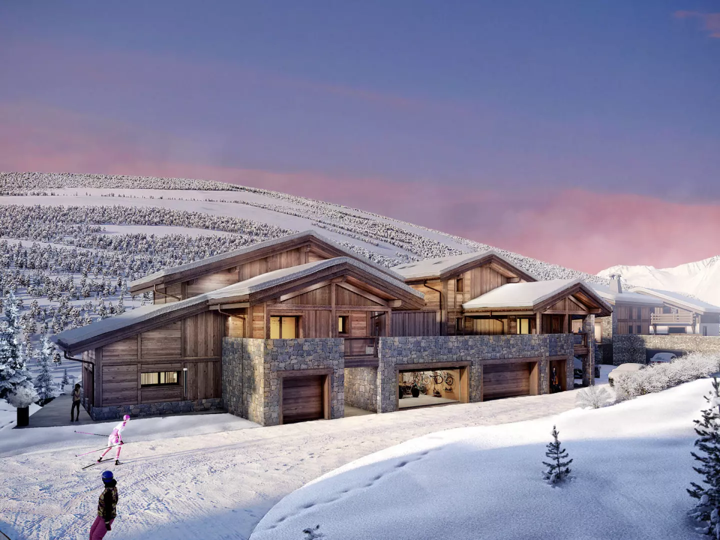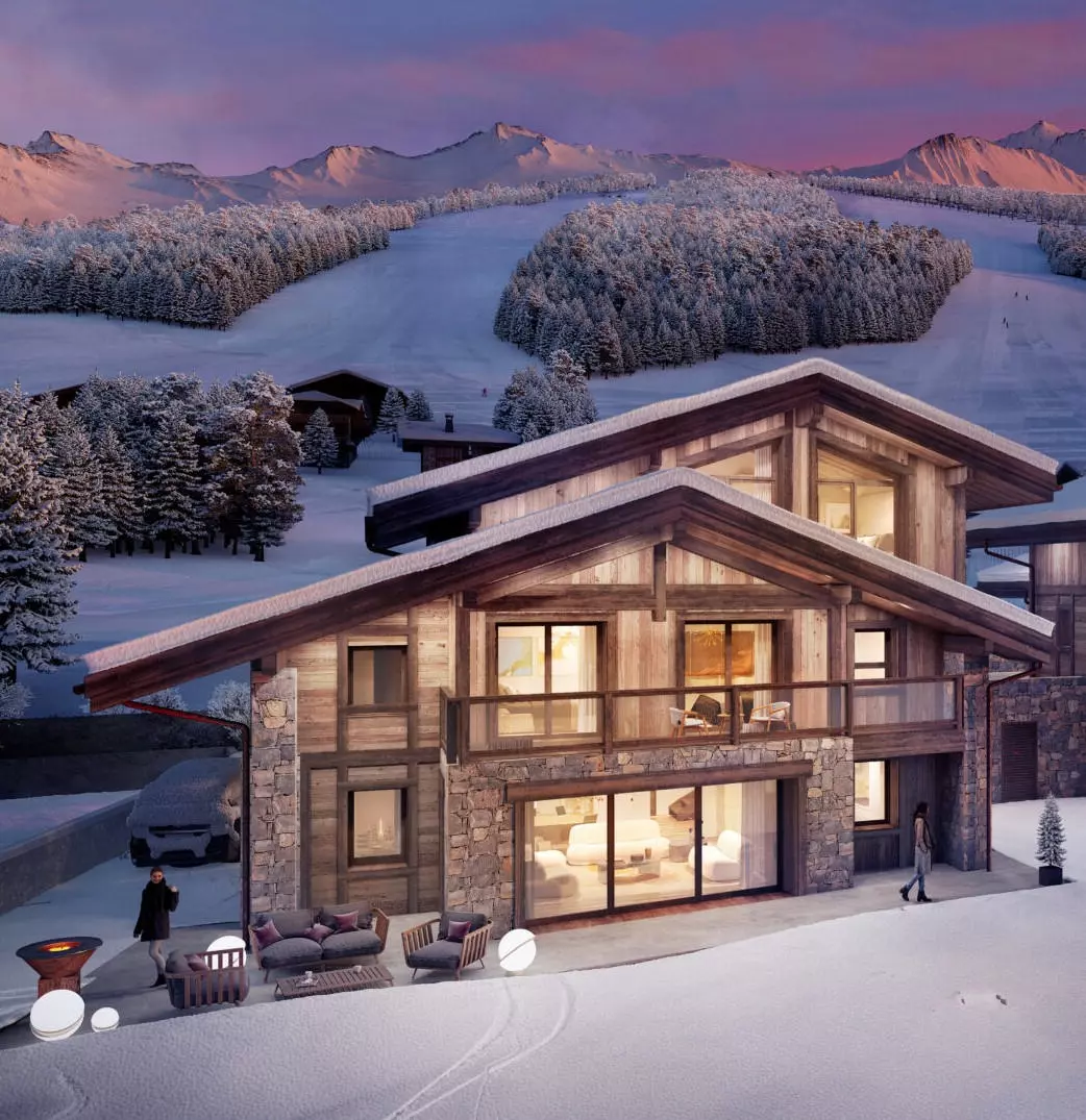 Each chalet consists of five ensuite bedrooms designed for functionality. The open-plan living area connects directly to a large terrace, enhancing the space and providing opportunities for outdoor activities. The west-facing orientation of these living areas allows for sunset views over the mountains, which can be an appealing aspect for residents.