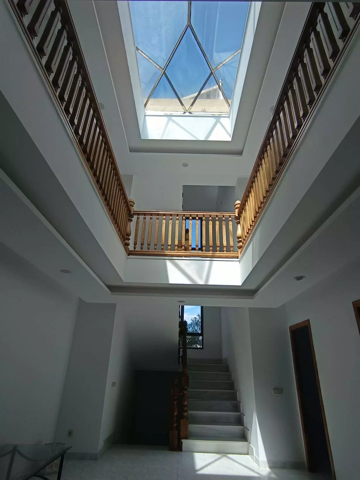 Constructed in 1988, the villa has a grand double-height entrance hall illuminated by a large roof lantern that fills the central area with light.