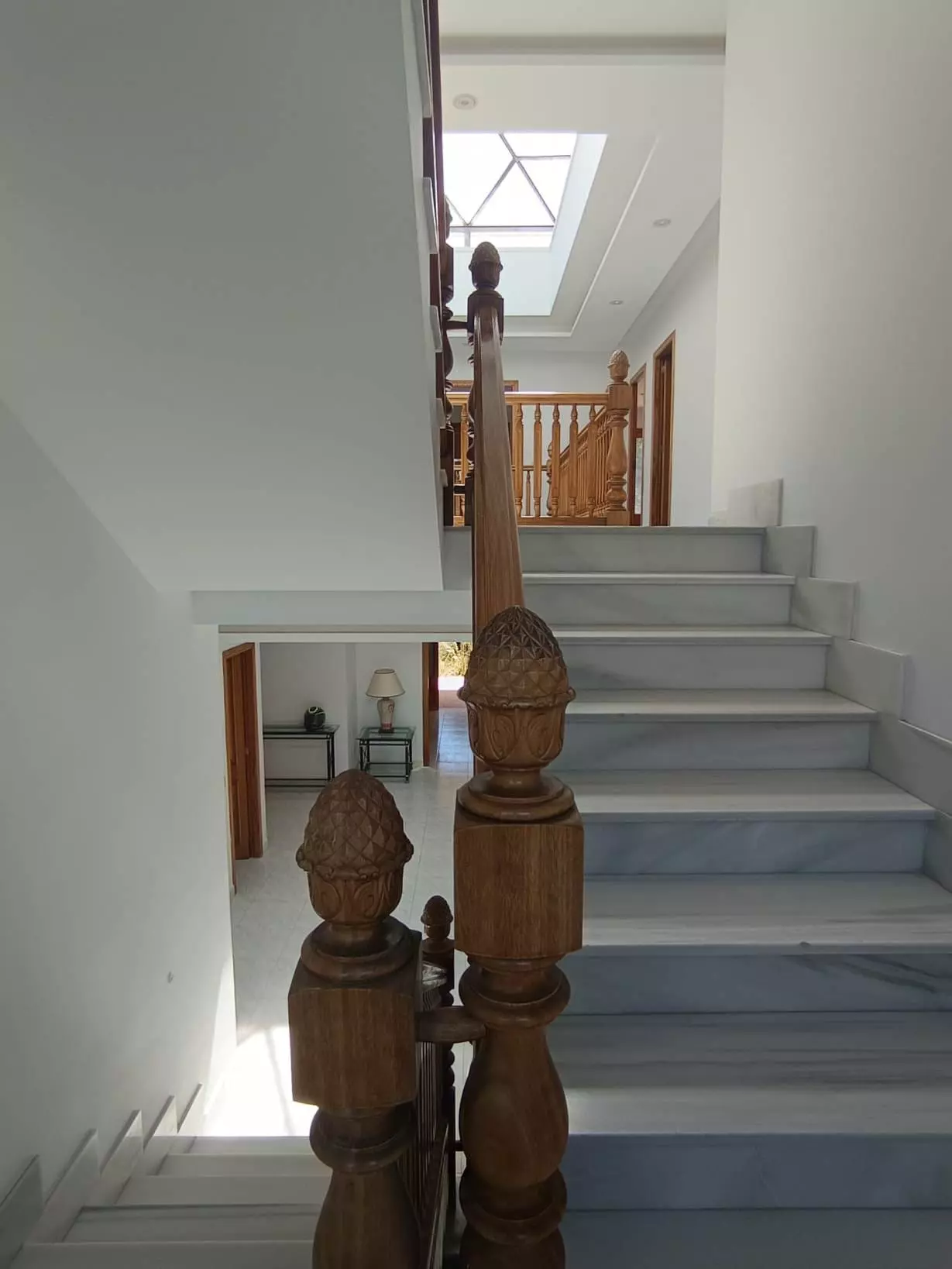 The first floor comprises five bedrooms. The two front-facing bedrooms have access through double doors to a spacious terrace that overlooks the countryside and leads down to the port. This terrace is also accessible via the main staircase. The remaining bedrooms feature full-height doors and Juliet balconies, ensuring a bright and airy atmosphere. There are three full bathrooms, one of which has been converted to a shower room, while the larger bathroom includes a jacuzzi bath.