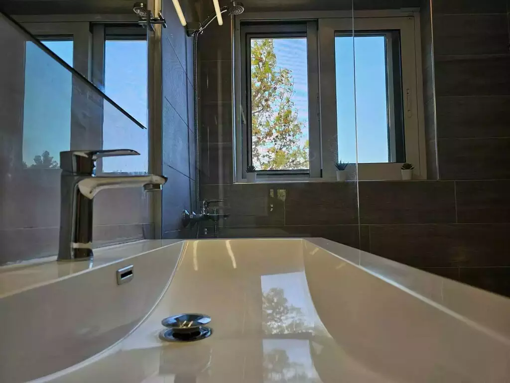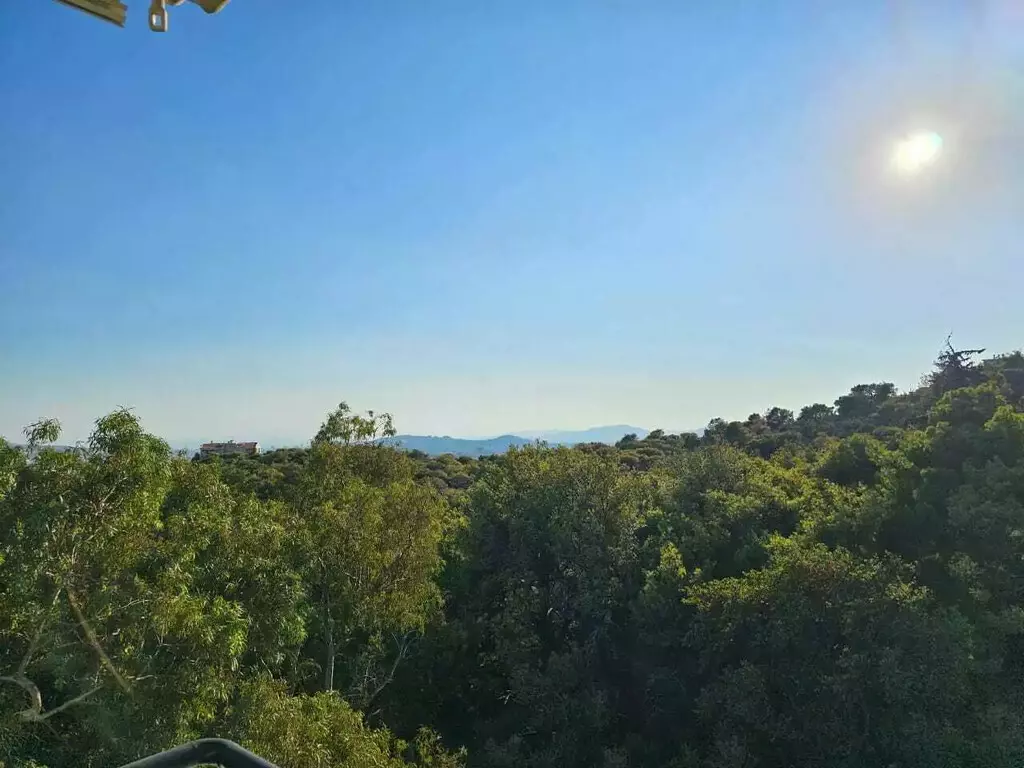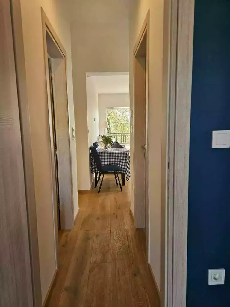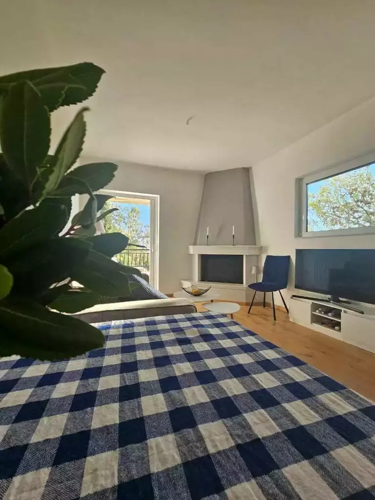 The apartment features a double-frontage layout, providing natural light and ventilation. From the windows, there is an unobstructed view of the mountains and nearby forest, contributing to an attractive outdoor ambiance. Practical amenities include solar panels for water heating, a fireplace, and air conditioning for temperature control. The heating system adds to the overall functionality of the unit.