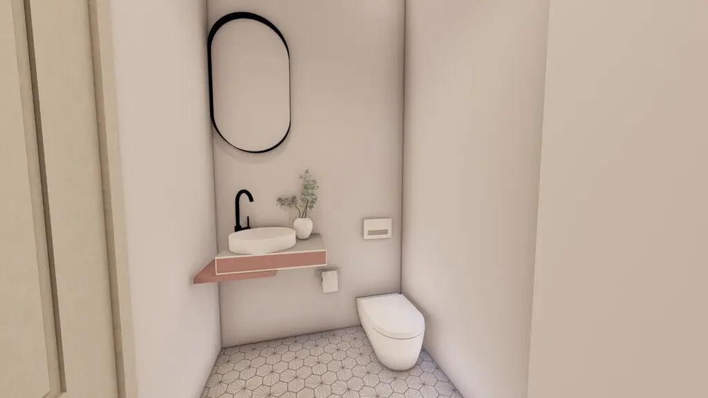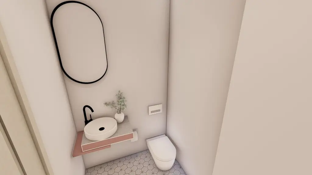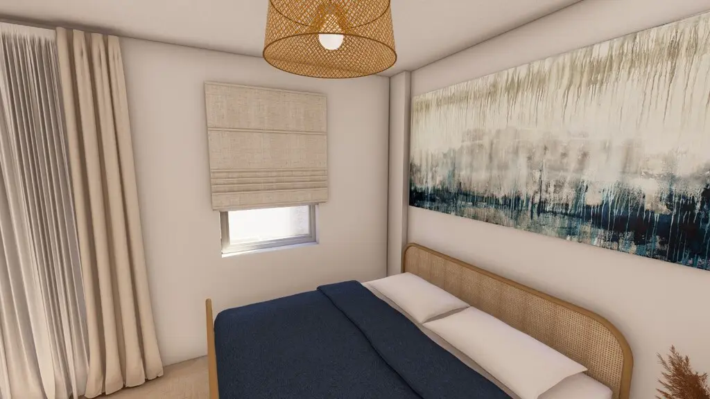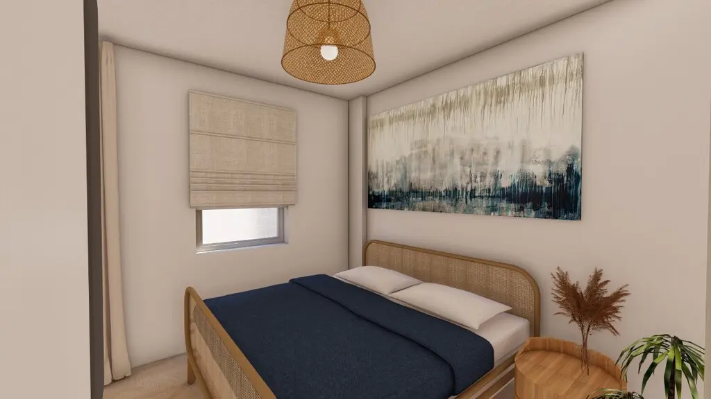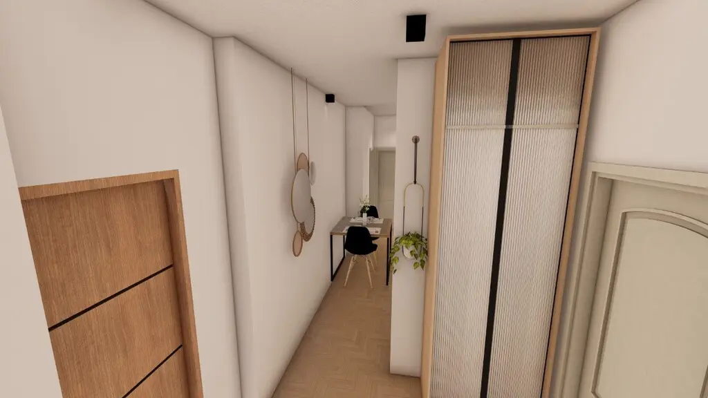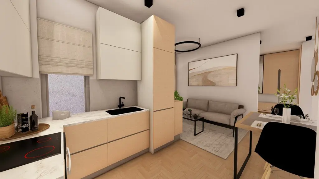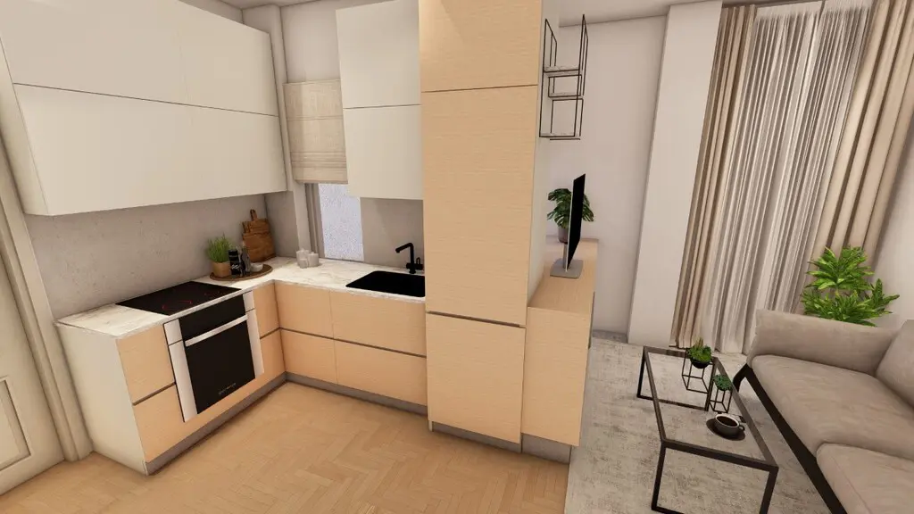This apartment features a straightforward layout with two bedrooms, a living room that integrates with the kitchen, and one shower WC. The interior layout is designed for efficiency, ensuring that all essential spaces are utilized effectively.