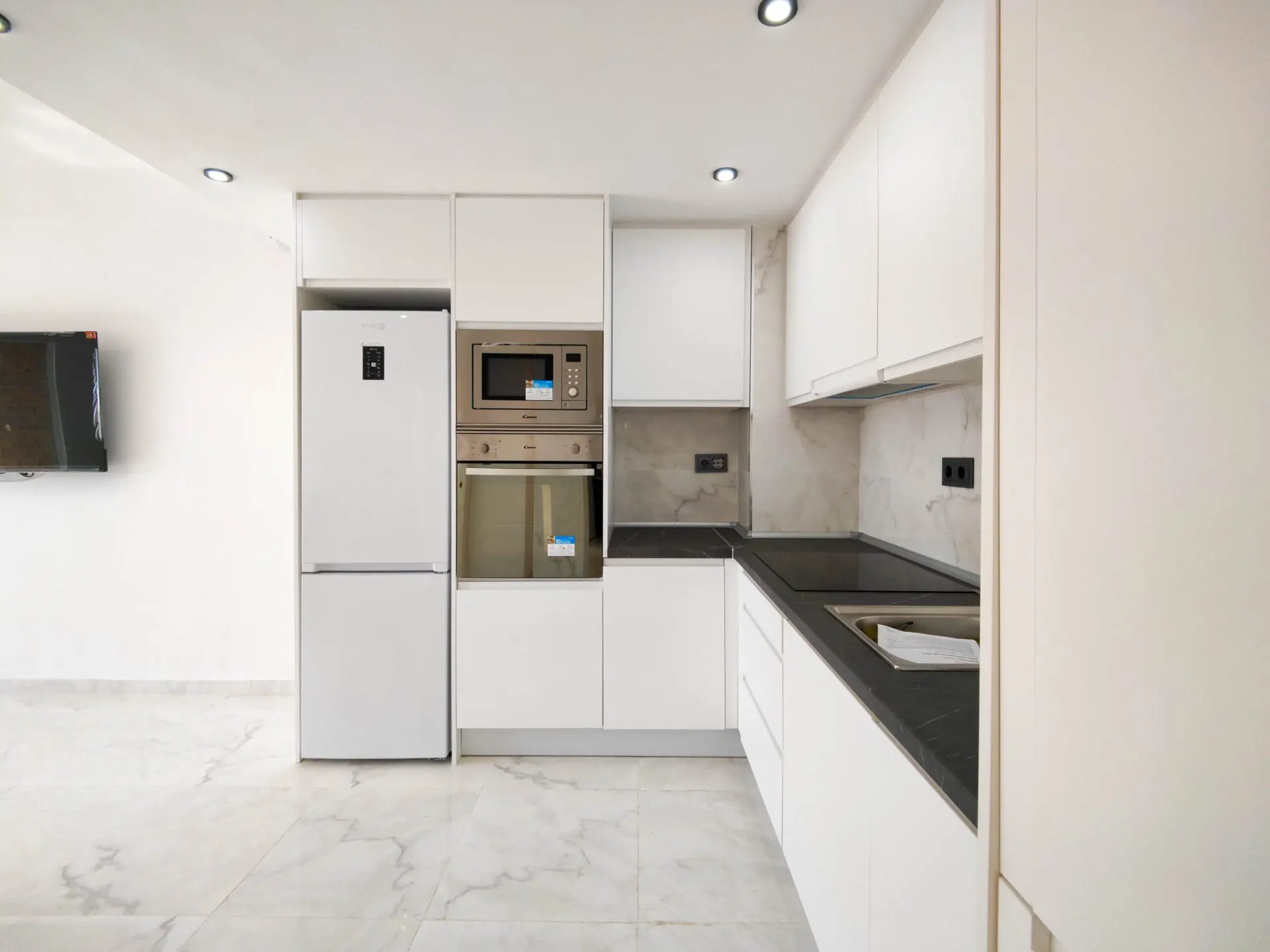 The bright living and dining area presents a newly integrated kitchen, perfect for those who enjoy cooking and entertaining. The layout is designed for functionality and comfort, allowing for an ideal flow between spaces.