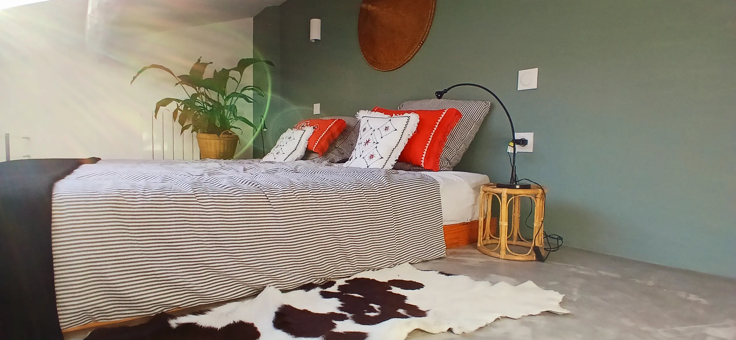 This house spans 70 m², having undergone a comprehensive renovation utilizing high-quality materials. It consists of two bedrooms, one featuring a mezzanine and the other opening up to a balcony with sea views. The entryway features a 30 m² courtyard, ideal for outdoor meals, and an open-plan living space that combines a kitchen and lounge, covering approximately 32 m². The kitchen is well-equipped with modern conveniences including a central island, a dishwasher, electric oven, and small fridge.