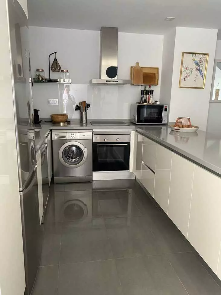 This apartment comes fully equipped, with all necessary items such as tableware, curtains, and beds included. The living room is furnished with a new sofa, while a new washing machine adds to the convenience of the property. The balcony is furnished with a table and chairs, providing a comfortable space for outdoor dining.