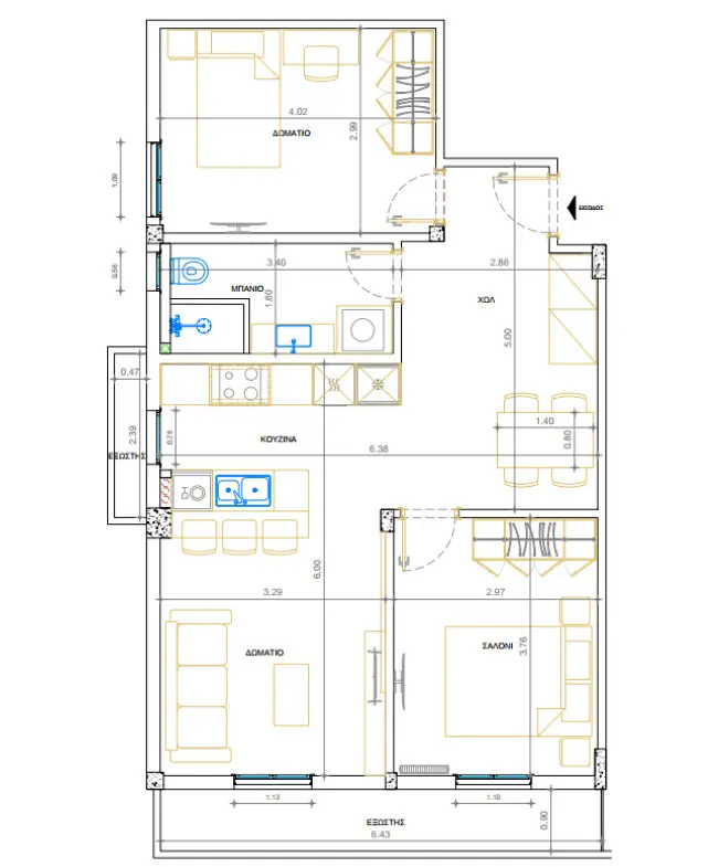 This apartment features two bedrooms, a living room that integrates with the kitchen, and one shower WC. The interior layout is designed to maximize the use of space, making it functional for daily activities.