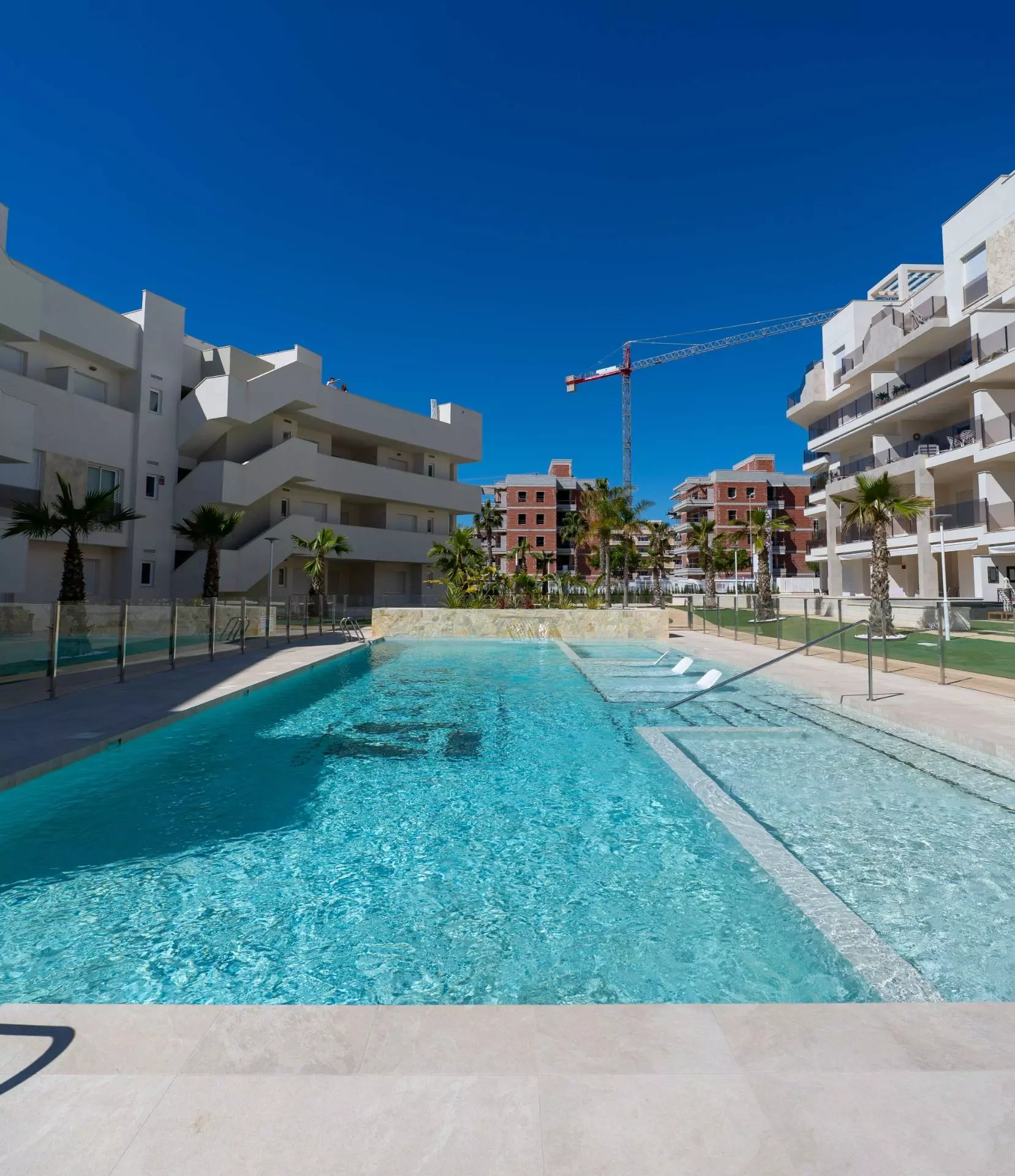 Discover a new build private residential complex in El Raso, Guardamar del Segura. This development features 135 apartments, available with either 2 or 3 bedrooms, spread across blocks of 3 to 5 floors, complete with solarium. The design emphasizes minimalism and high-quality standards, blending modern architecture with large open spaces and natural surroundings.