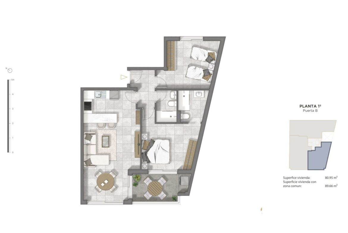 A new residential complex is taking shape in the center of Guardamar del Segura, strategically positioned near various amenities. This development features a range of 2 and 3-bedroom apartments, along with 3-bedroom penthouses. Each unit includes an open-plan kitchen adjacent to a living room, fitted wardrobes, terraces, and storage rooms.